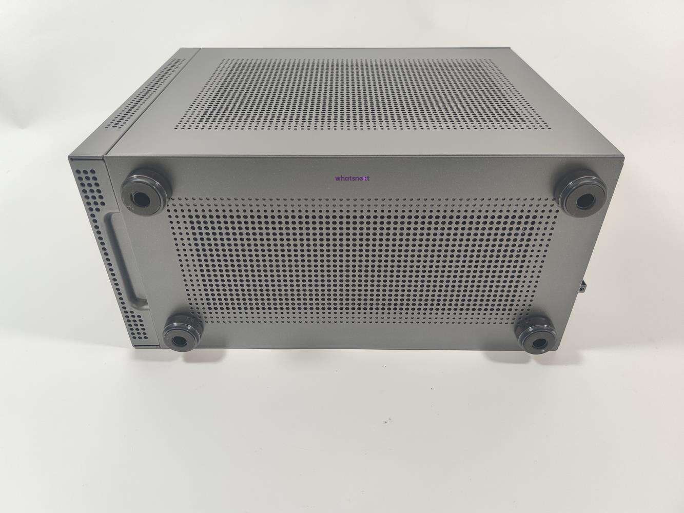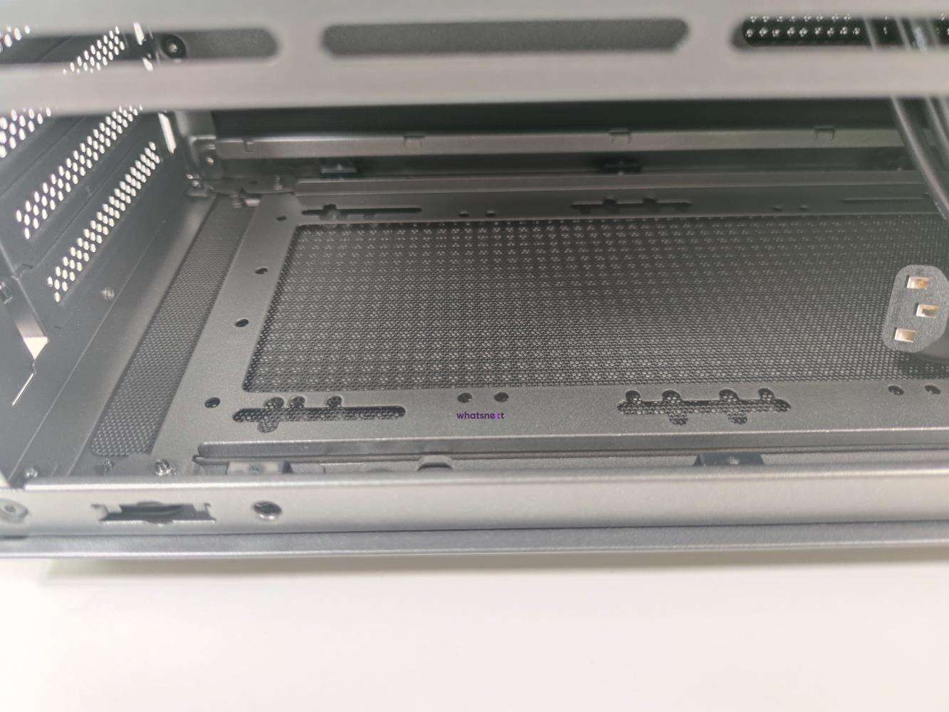 Krux Naos stoi na czterech nóżkach z piankowym wyłożeniem. Trochę ślizga się on po biurku, ale generalnie stoi stabilnie. Na dole ponownie możecie zobaczyć perforacje wraz z filtrem. Tutaj również jest miejsce na dwa wentylatory 120 mm.