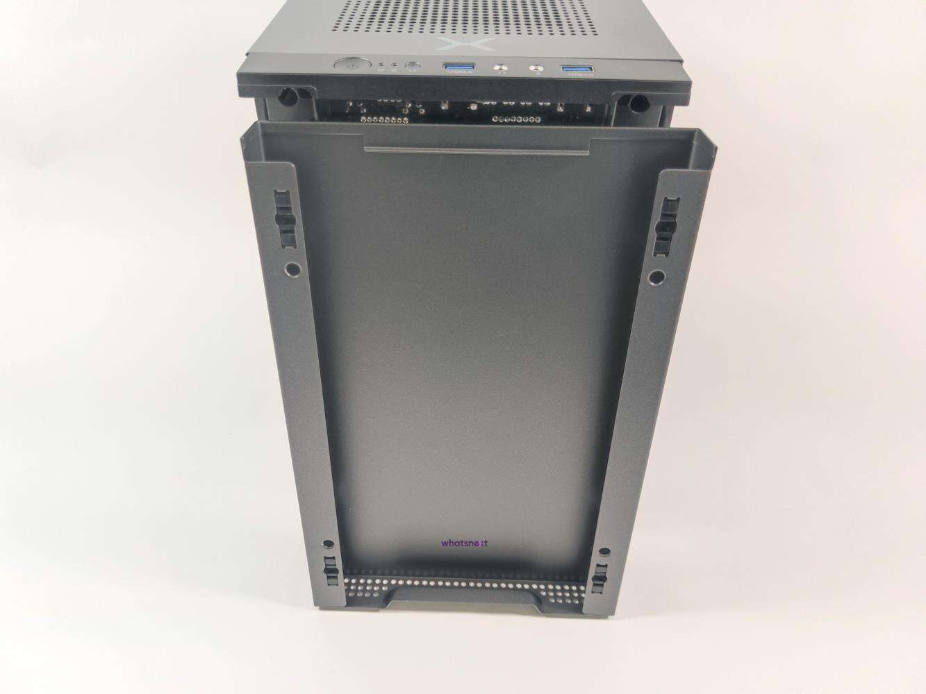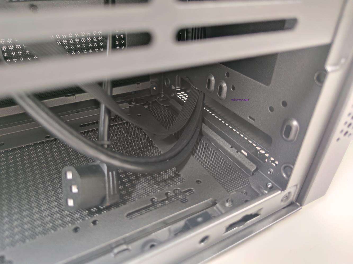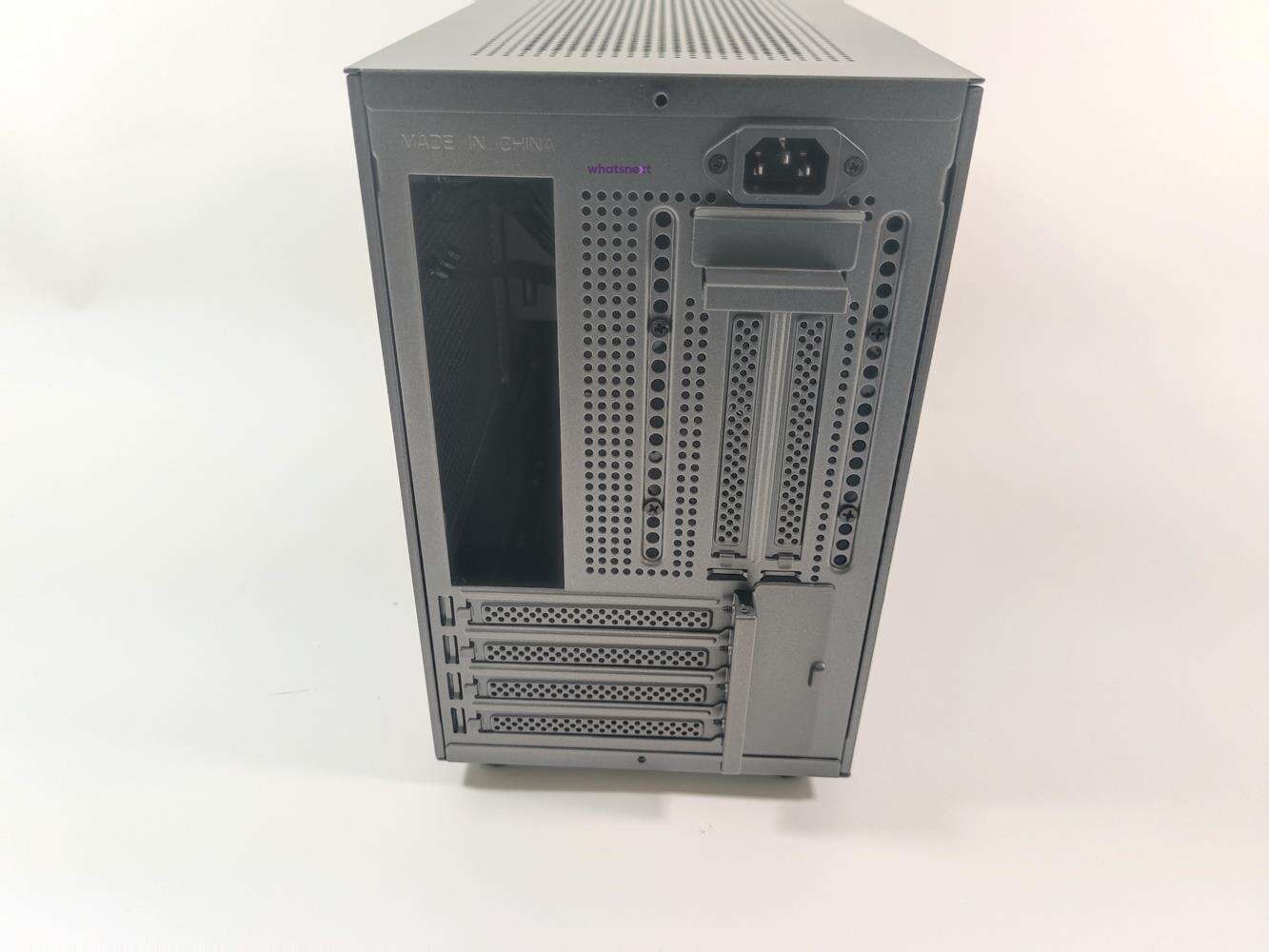 Z tyłu możecie zobaczyć cztery poziomie zaślepki PCI i dwie pionowe. Kartę graficzną możecie więc zamontować pionowo, co niewątpliwie jest plusem. Poza tym jest też wejście na kabel zasilający oraz 80 mm wentylator ukryty za pionowymi zaślepkami PCI.