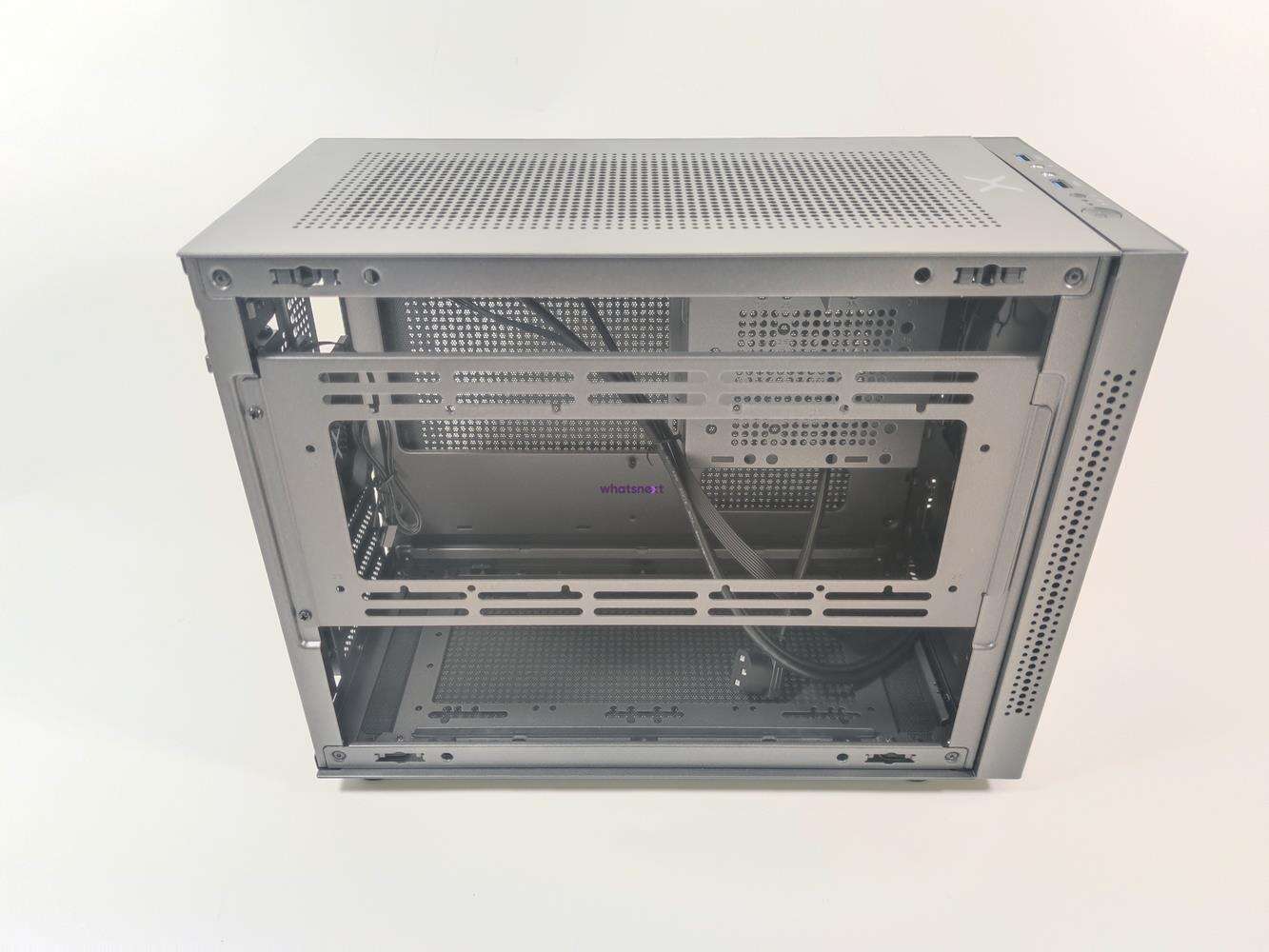 Sama obudowa nie zaskakuje wyglądem. Jest ona cała czarna (przynajmniej wg producenta, moim zdaniem jest to bardziej szary kolor) i nie ma podświetlenia. W wersji z bocznym oknem będzie jednak widać środek, co przy AiO z ARGB czy odpowiednich wentylatorach może nieźle wyglądać.