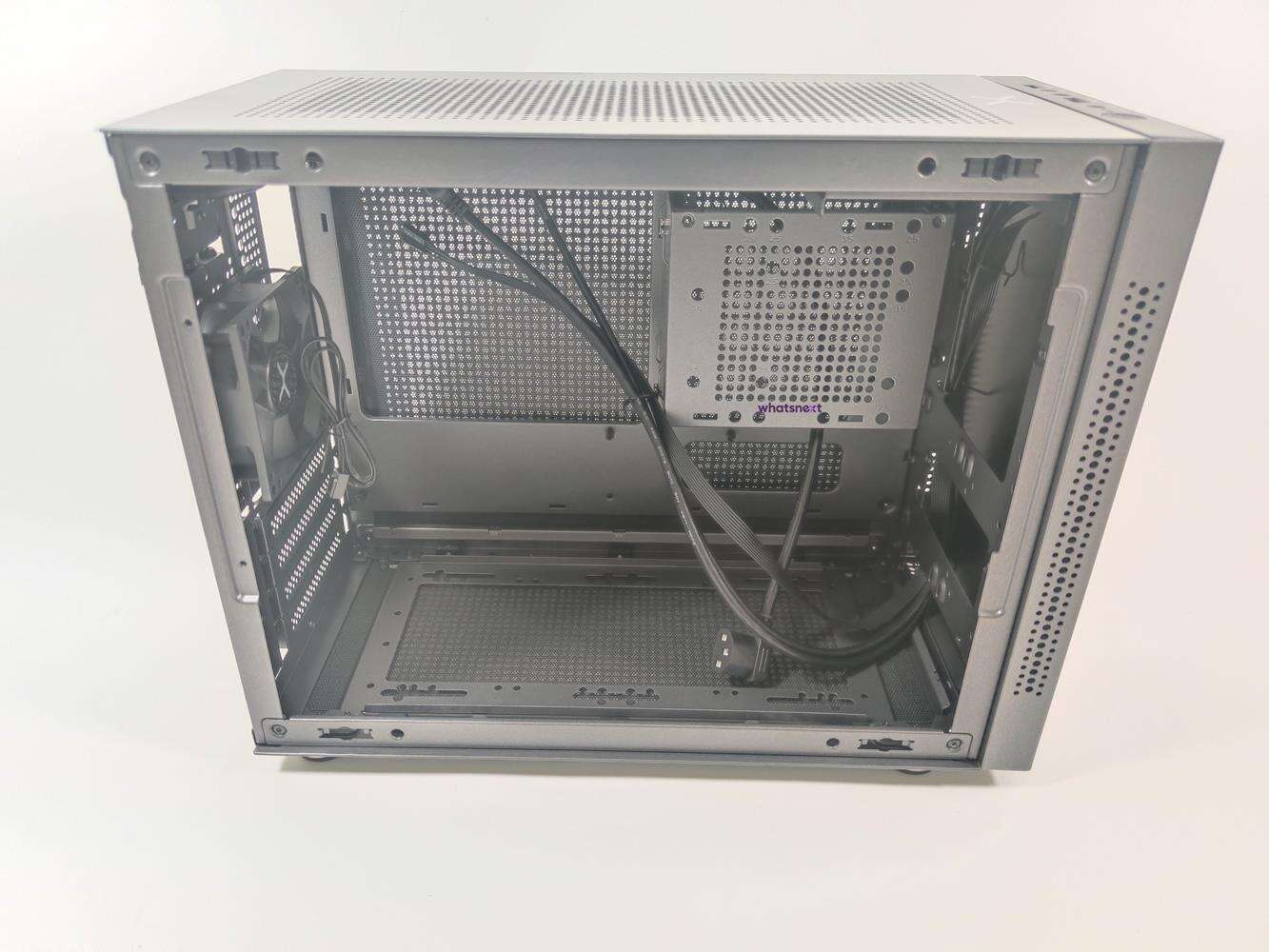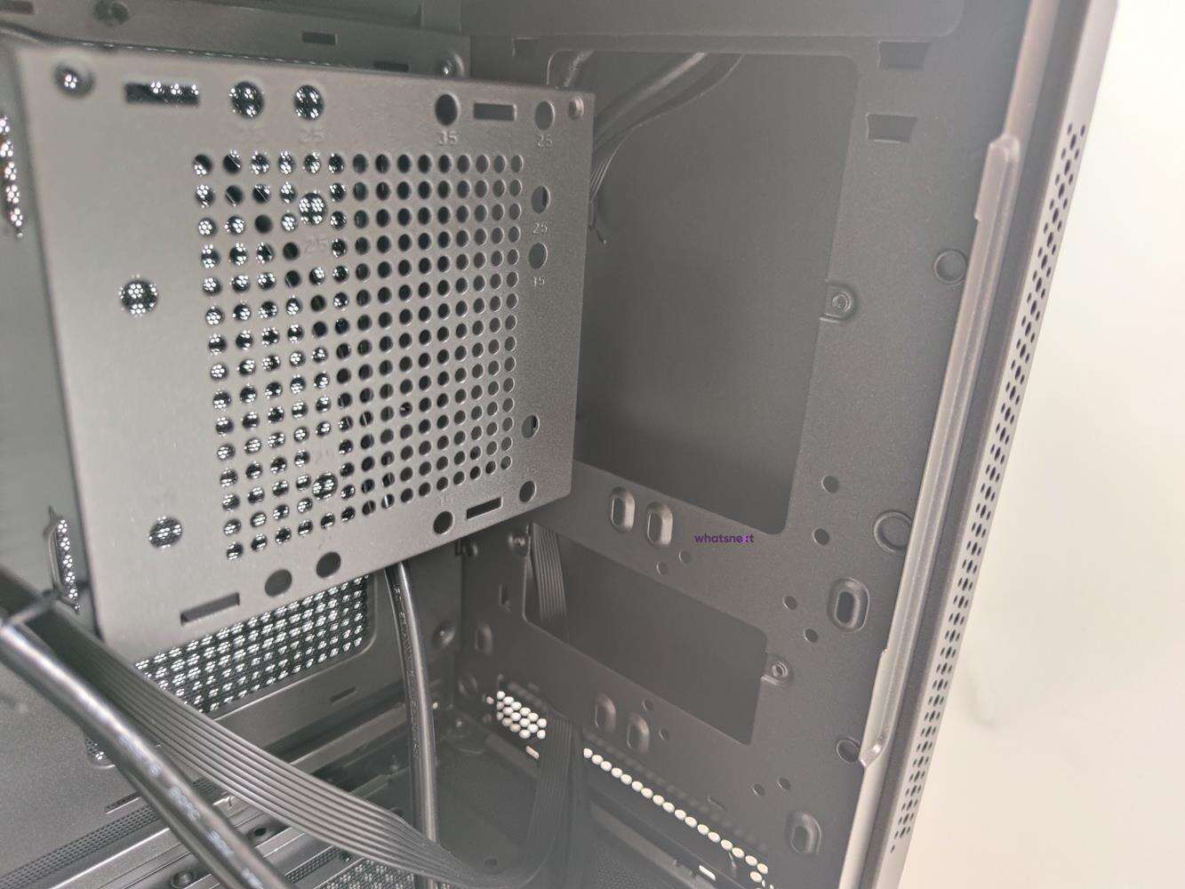 Wnętrze wydaje się ciasne, ale po demontażu mocowań na dyski czy wentylatory jest znacznie przestronniej. Zasilacz montuje się w prawym górnym rogu i jest tam podciągnięty kabel zasilający. Łącznie wszystkie mocowania pozwalają na montaż do dziewięciu dysków 2,5 cala lub pięciu 3,5 cala, więc miejsca jest naprawdę sporo.