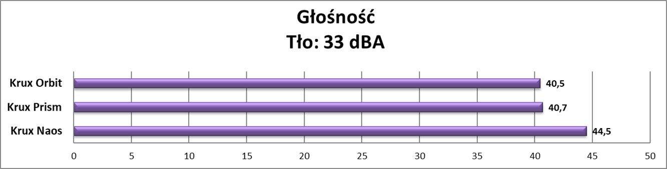 - Głośność zmierzyłem przy zamkniętej obudowie z odległości 20 cm od środka lewego boku – tło wynosiło 33 dBA.
