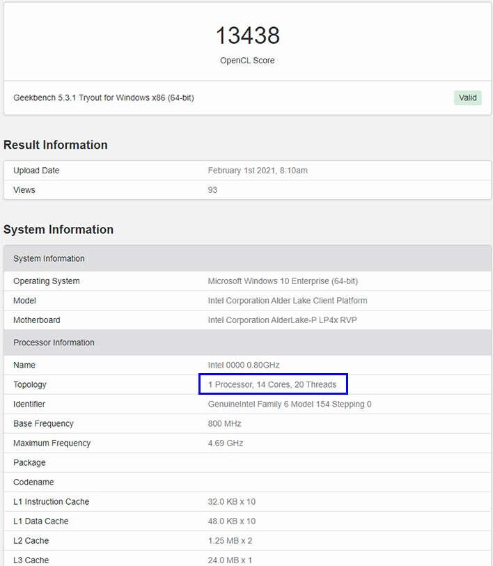 Przetestowana konstrukcja ma 14 rdzeni oraz 20 wątków. Ma ona 6 wydajnych rdzeni Golden Cove oraz 8 energooszczędnych Gracemont. Układ sparowany został z pamięcią LPDDR4X, a jego częstotliwość dochodzi do 4,70 GHz.
