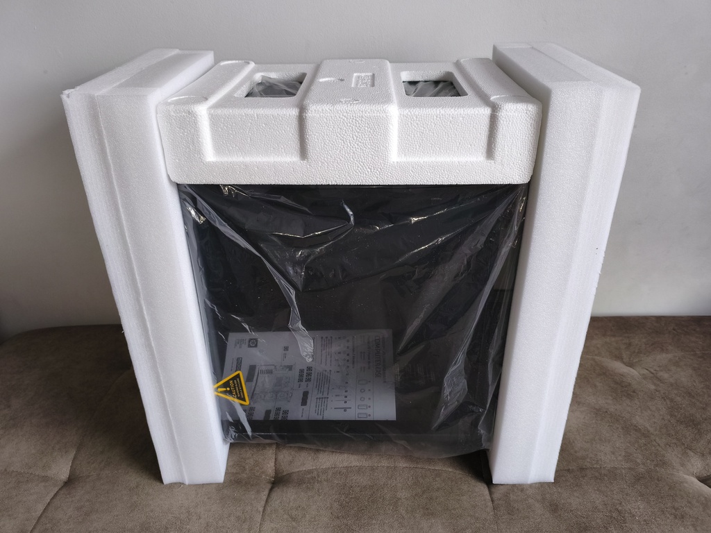 Wnętrze opakowania chronione jest grubą warstwą twardego styropianu, który ma skutecznie amortyzować wstrząsy i uderzenia mogące wystąpić podczas transportu. Dodatkowo sama obudowa została owinięta folią zabezpieczającą przed zarysowaniami, co w teorii zwiększa szansę dotarcia jej do użytkownika w stanie idealnym.