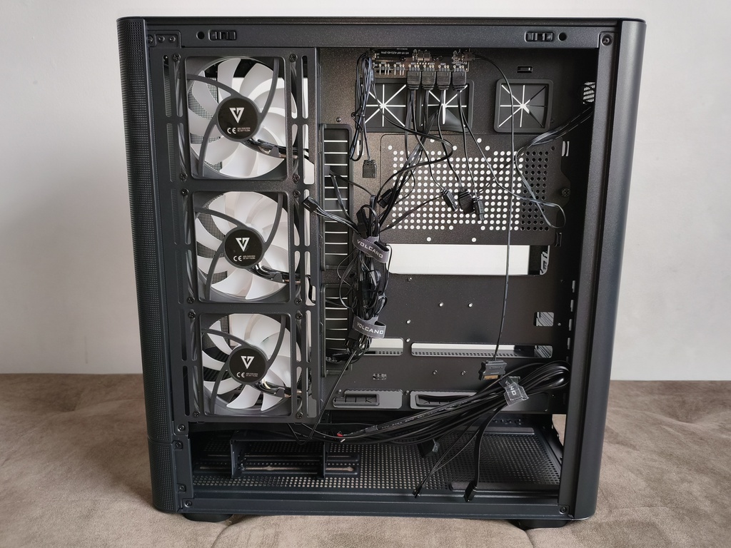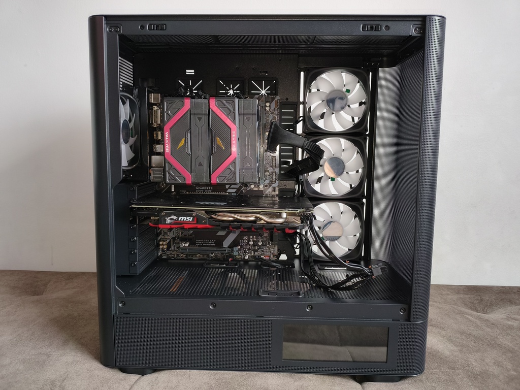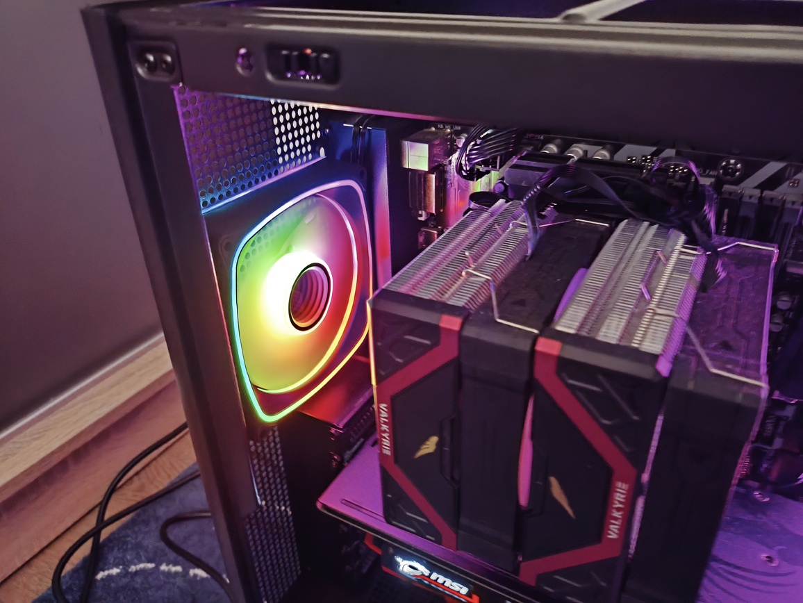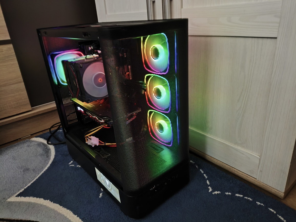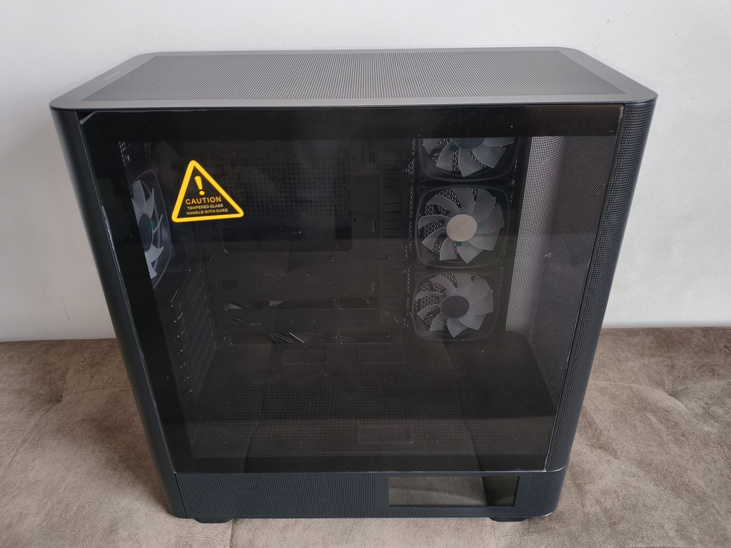 Jednocześnie nie jest to konstrukcja pozbawiona kompromisów. Największe zastrzeżenia dotyczą szeroko rozumianej wydajności chłodzenia, a dokładniej – charakterystyki przepływu powietrza. Umieszczenie trzech wentylatorów na bocznym panelu, choć efektowne wizualnie, nie sprzyja optymalnemu airflow i w praktyce przekłada się na mniej korzystne temperatury, szczególnie w przypadku kart graficznych. To nie jest problem jednostkowy, ale w tej konkretnej konfiguracji staje się wyraźnie odczuwalny. Oczywiście przy niższych prędkościach obrotowych (okolice 1200 RPM) kultura pracy pozostaje na dobrym poziomie, a sam przepływ powietrza jest wystarczający dla wielu zestawów, jednak trudno mówić tutaj o bezkompromisowej wydajności termicznej.