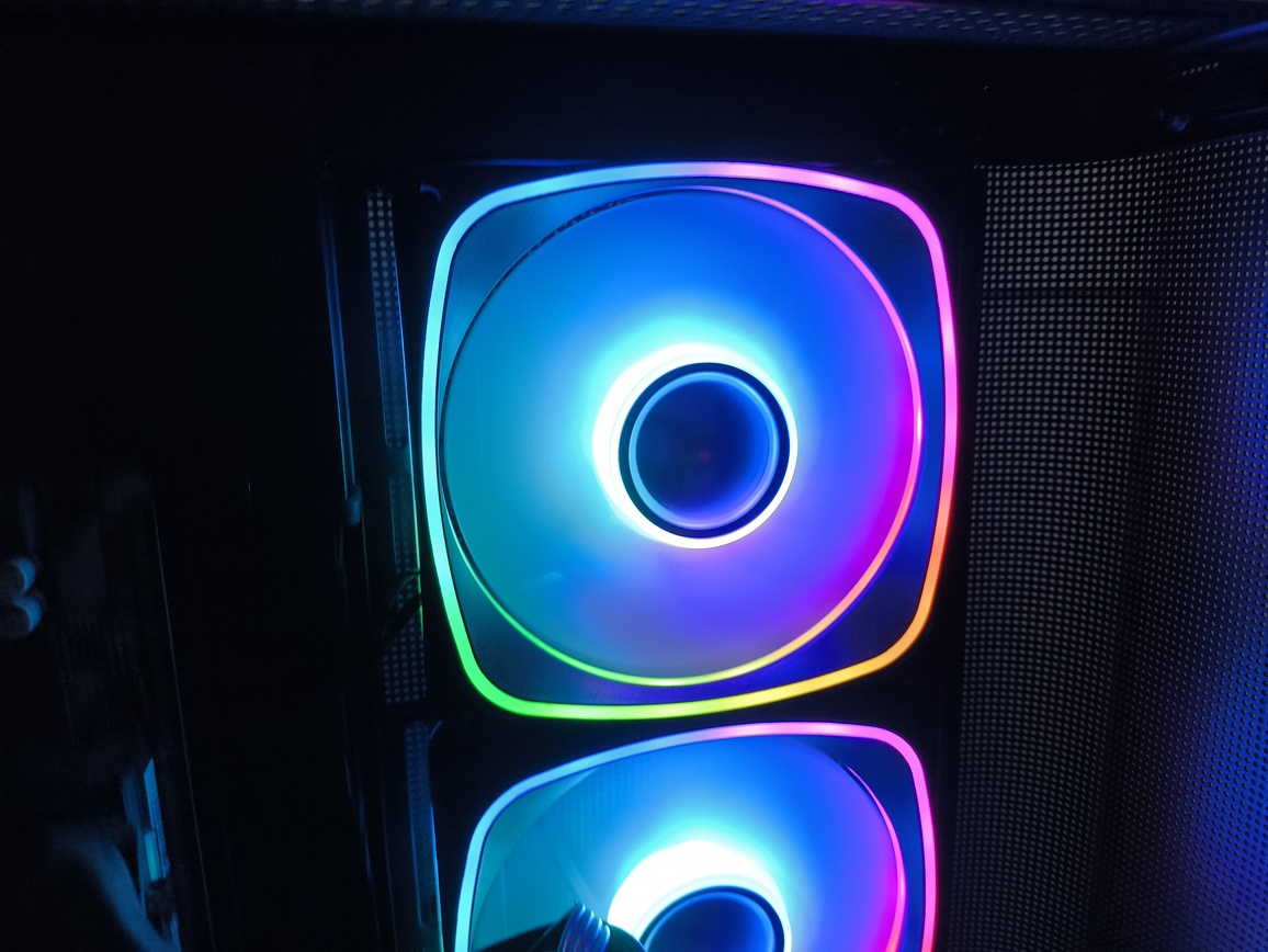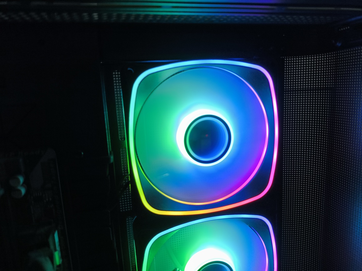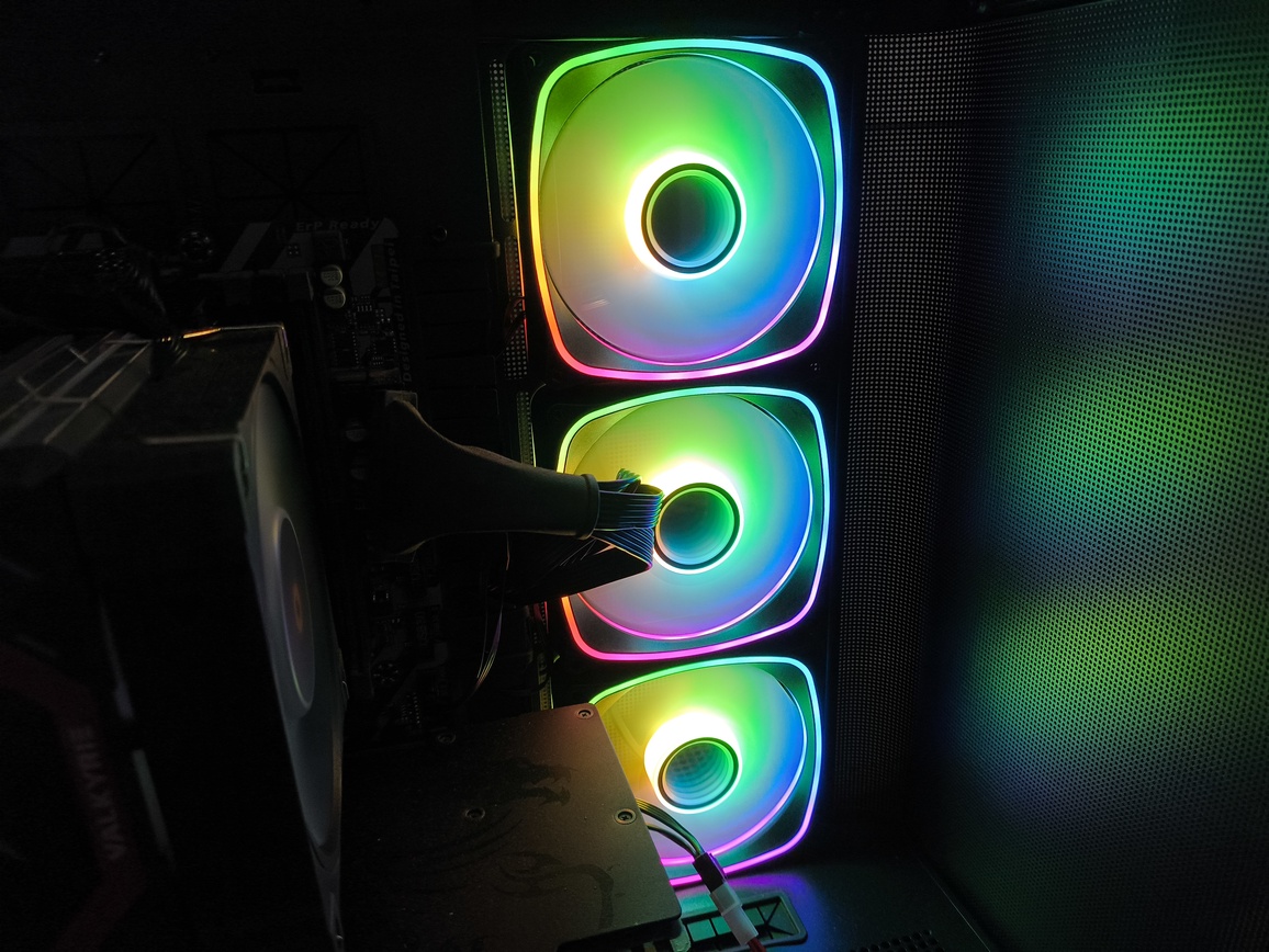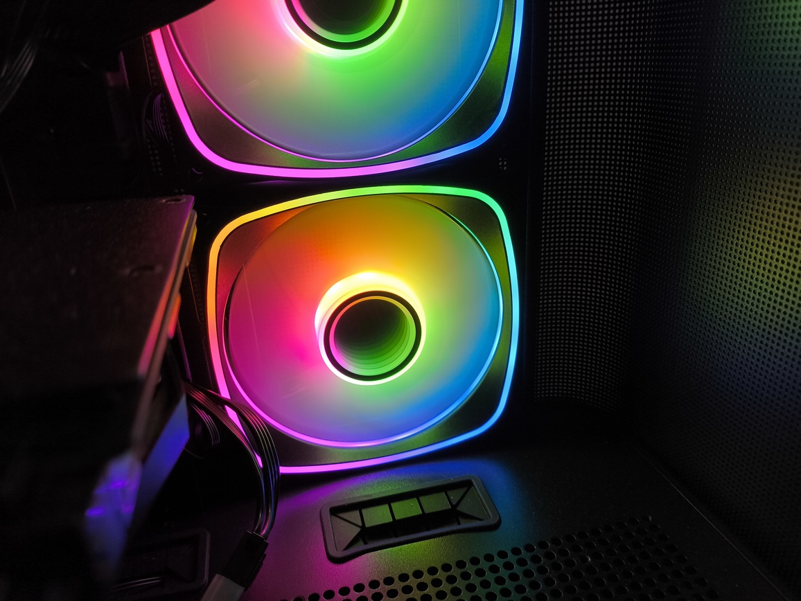 Jednocześnie nie jest to konstrukcja pozbawiona kompromisów. Największe zastrzeżenia dotyczą szeroko rozumianej wydajności chłodzenia, a dokładniej – charakterystyki przepływu powietrza. Umieszczenie trzech wentylatorów na bocznym panelu, choć efektowne wizualnie, nie sprzyja optymalnemu airflow i w praktyce przekłada się na mniej korzystne temperatury, szczególnie w przypadku kart graficznych. To nie jest problem jednostkowy, ale w tej konkretnej konfiguracji staje się wyraźnie odczuwalny. Oczywiście przy niższych prędkościach obrotowych (okolice 1200 RPM) kultura pracy pozostaje na dobrym poziomie, a sam przepływ powietrza jest wystarczający dla wielu zestawów, jednak trudno mówić tutaj o bezkompromisowej wydajności termicznej.
