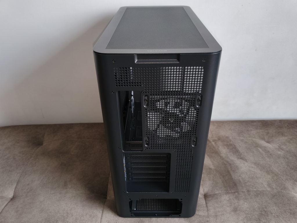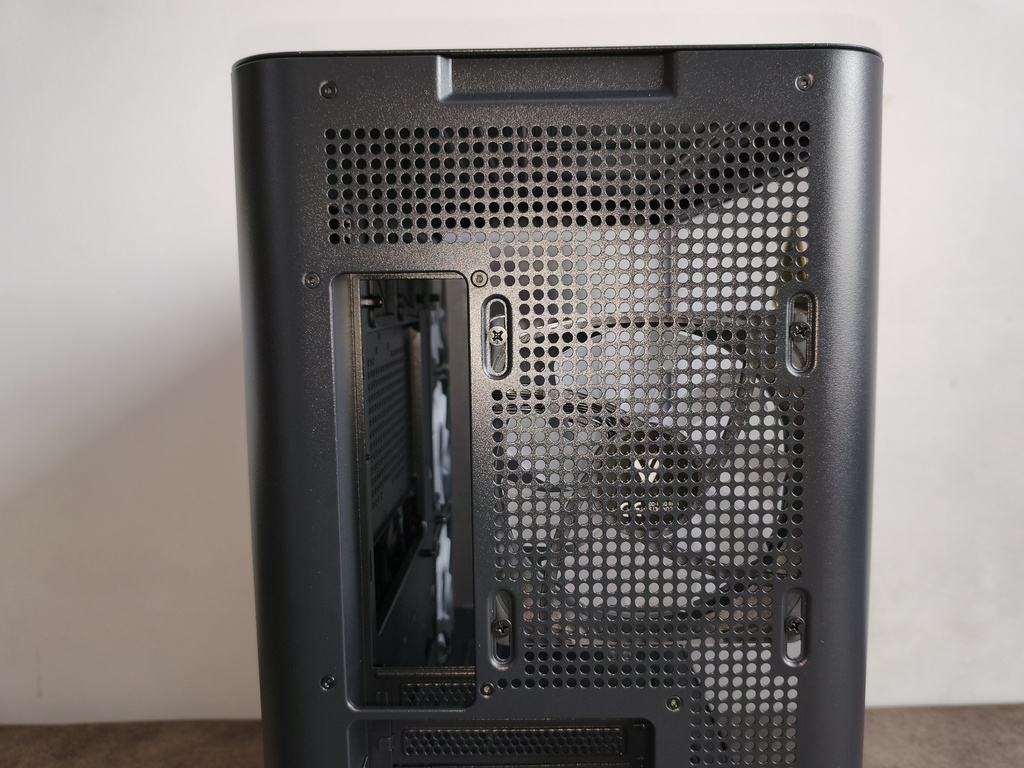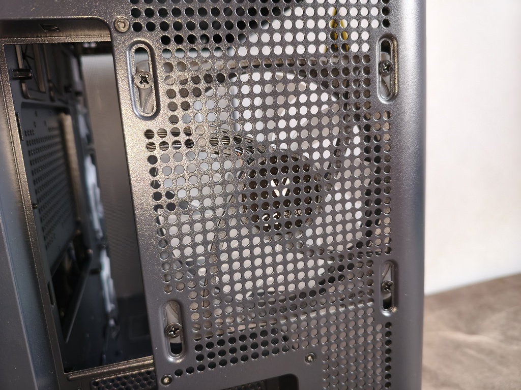 Znaczną część tylnego panelu pokrywają perforacje o strukturze mocno zbliżonej do tych stosowanych w zaślepkach kart rozszerzeń, jednak o wyraźnie większych otworach. Takie rozwiązanie poprawia zdolność odprowadzania nagrzanego powietrza, co w przypadku konstrukcji z dużą ilością przeszkleń i ograniczoną wentylacją górną ma istotne znaczenie dla utrzymania odpowiedniej cyrkulacji wewnątrz obudowy.
