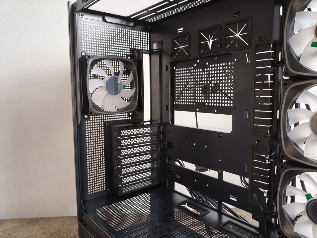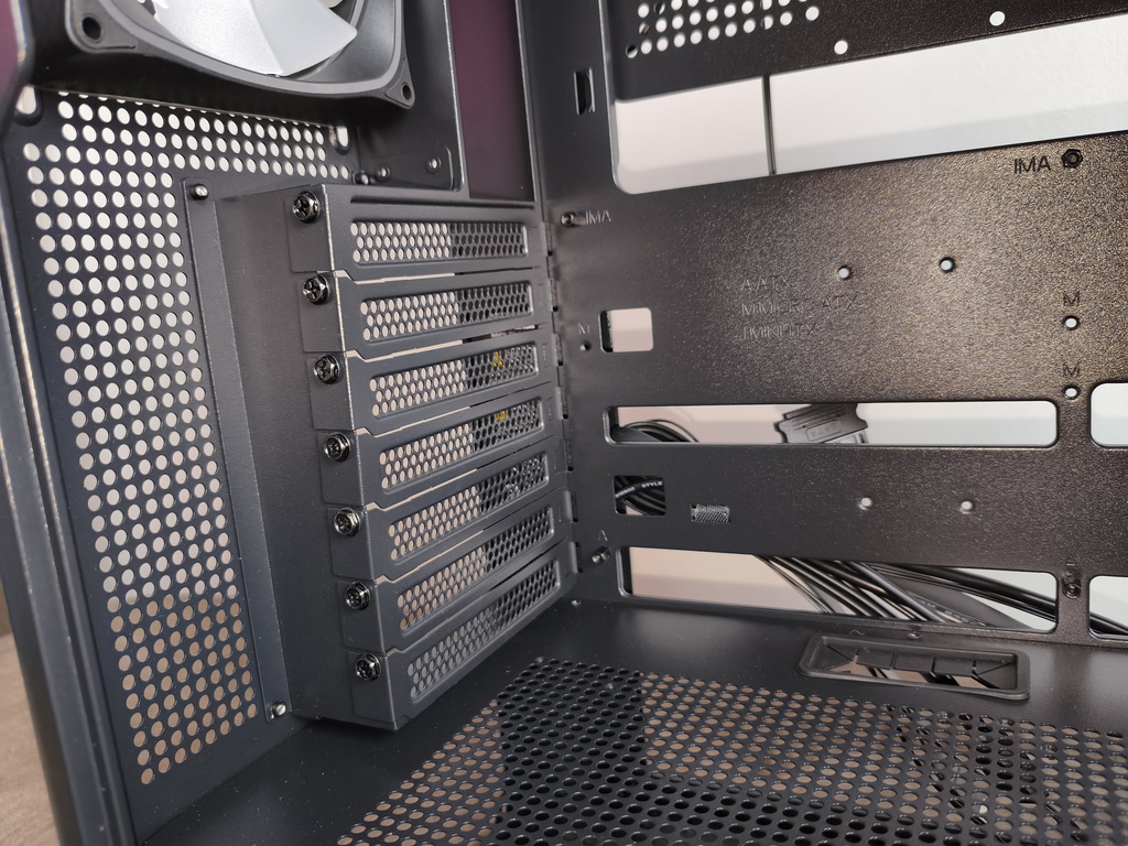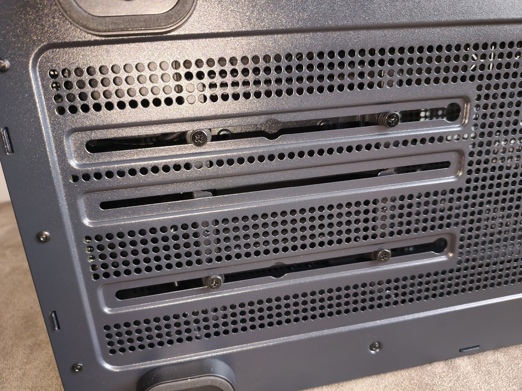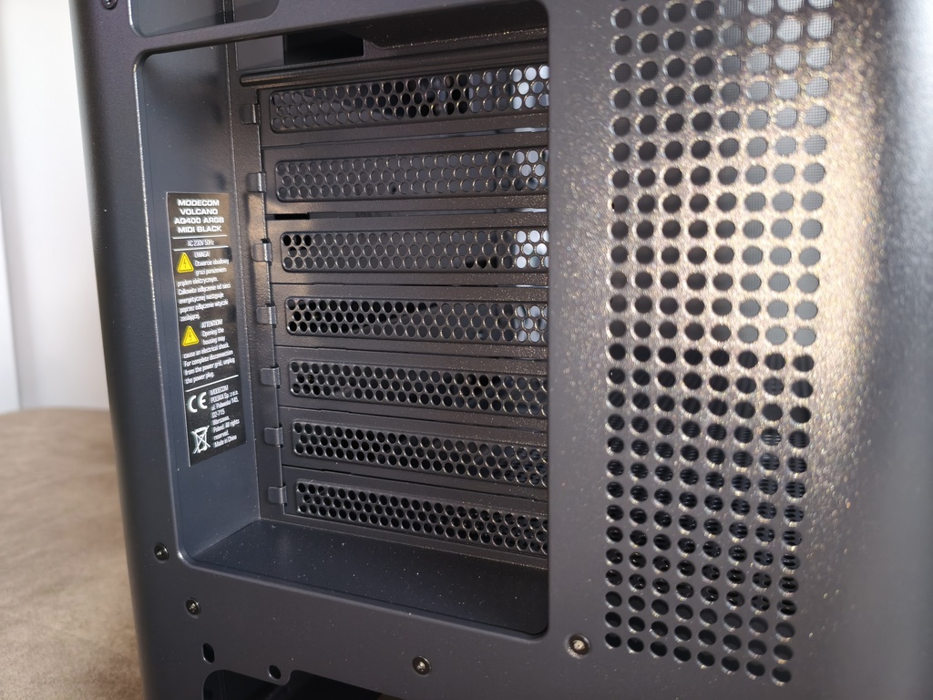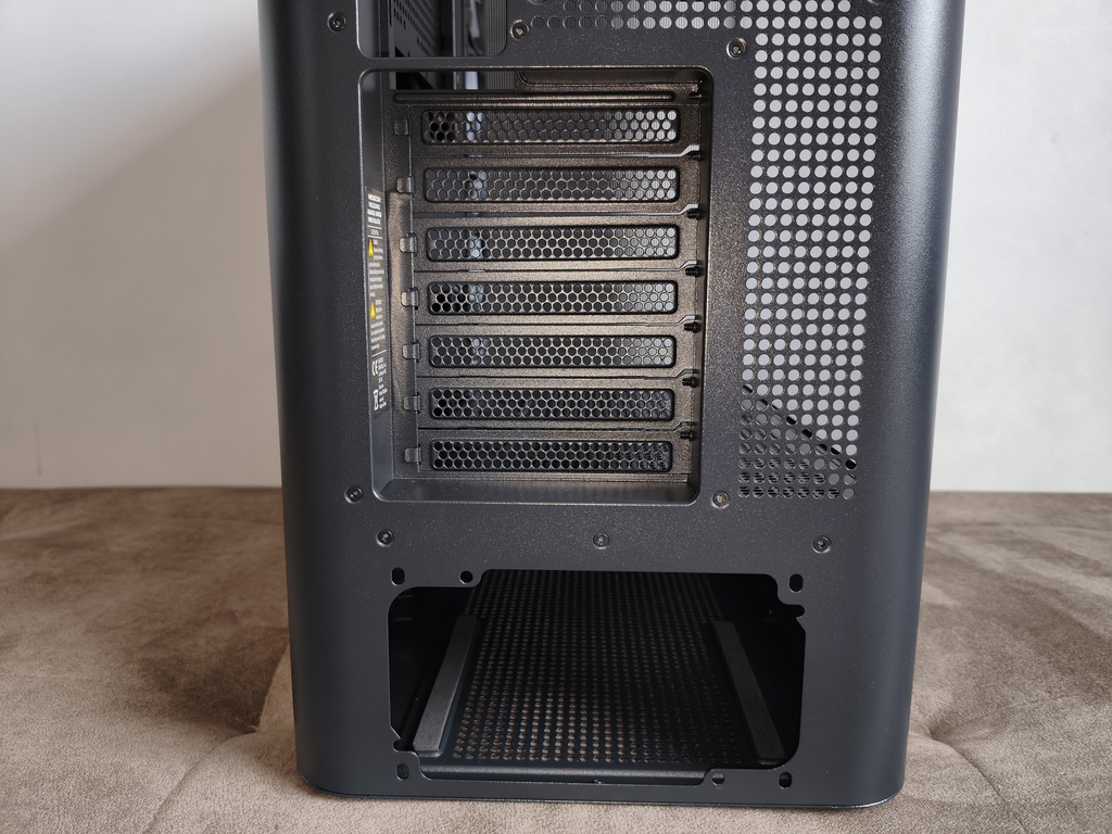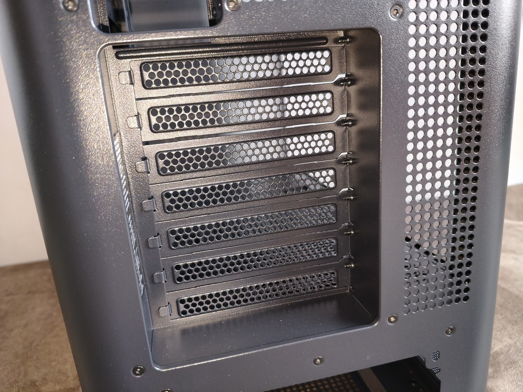 Obudowę wyposażono w 7 slotów dla kart rozszerzeń, które zostały wykonane jako metalowe, wielokrotnego użytku zaślepki o wyraźnie perforowanej strukturze. Zastosowano tu wzór okrągłych otworów, co w jakiś tam sposób zwiększa przepływ powietrza w tylnej części obudowy i jednocześnie zachowuje odpowiednią sztywność całego segmentu. Każda zaślepka mocowana jest klasycznymi śrubami od strony wewnętrznej, co zapewnia stabilne i pewne osadzenie komponentów.