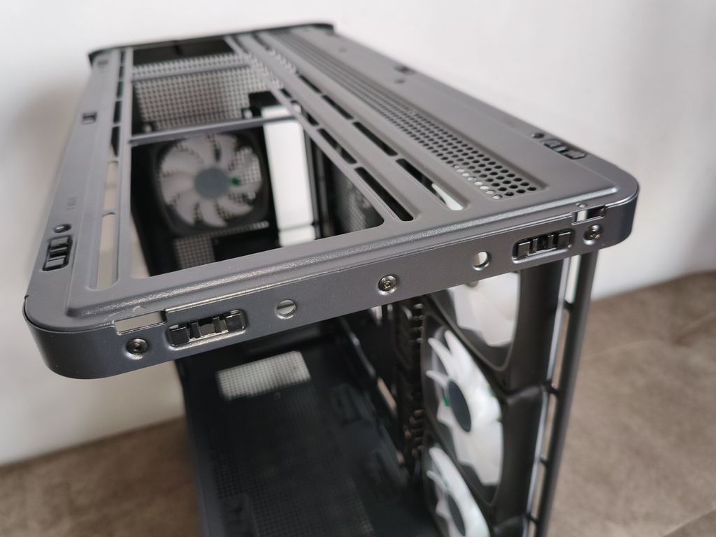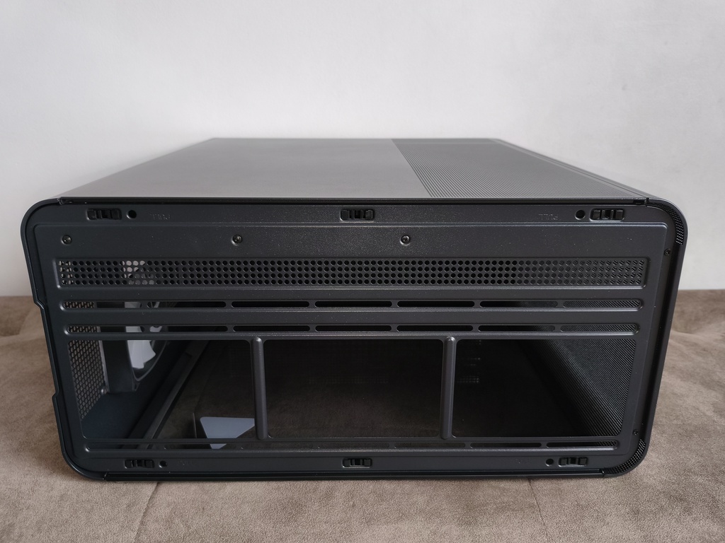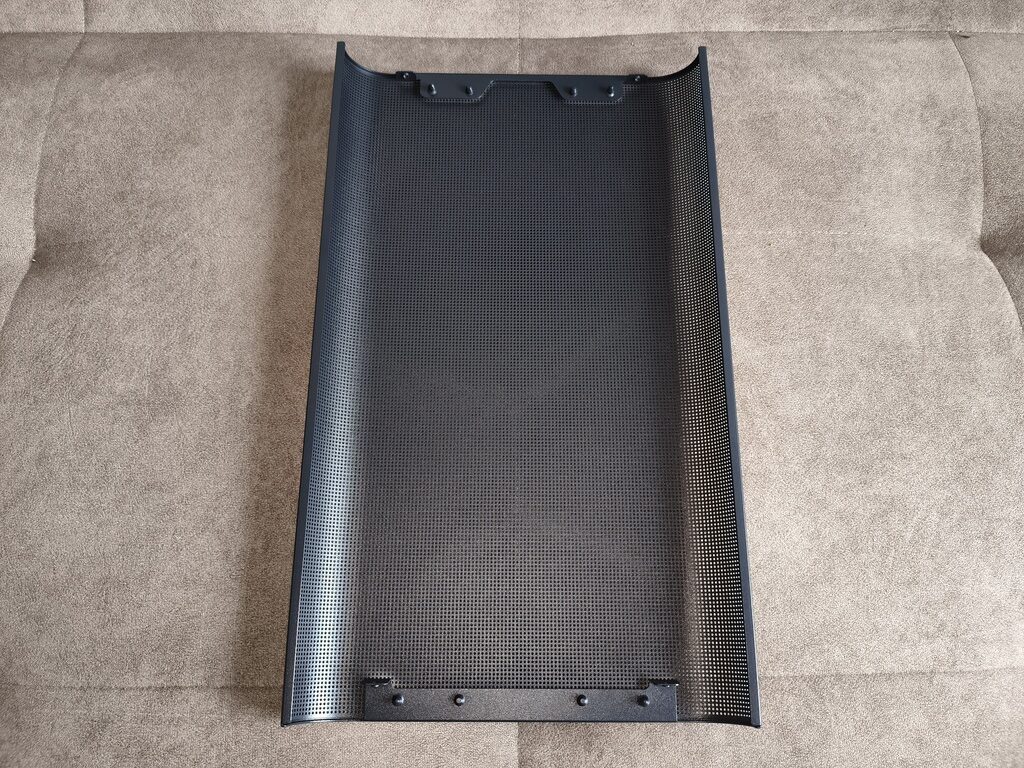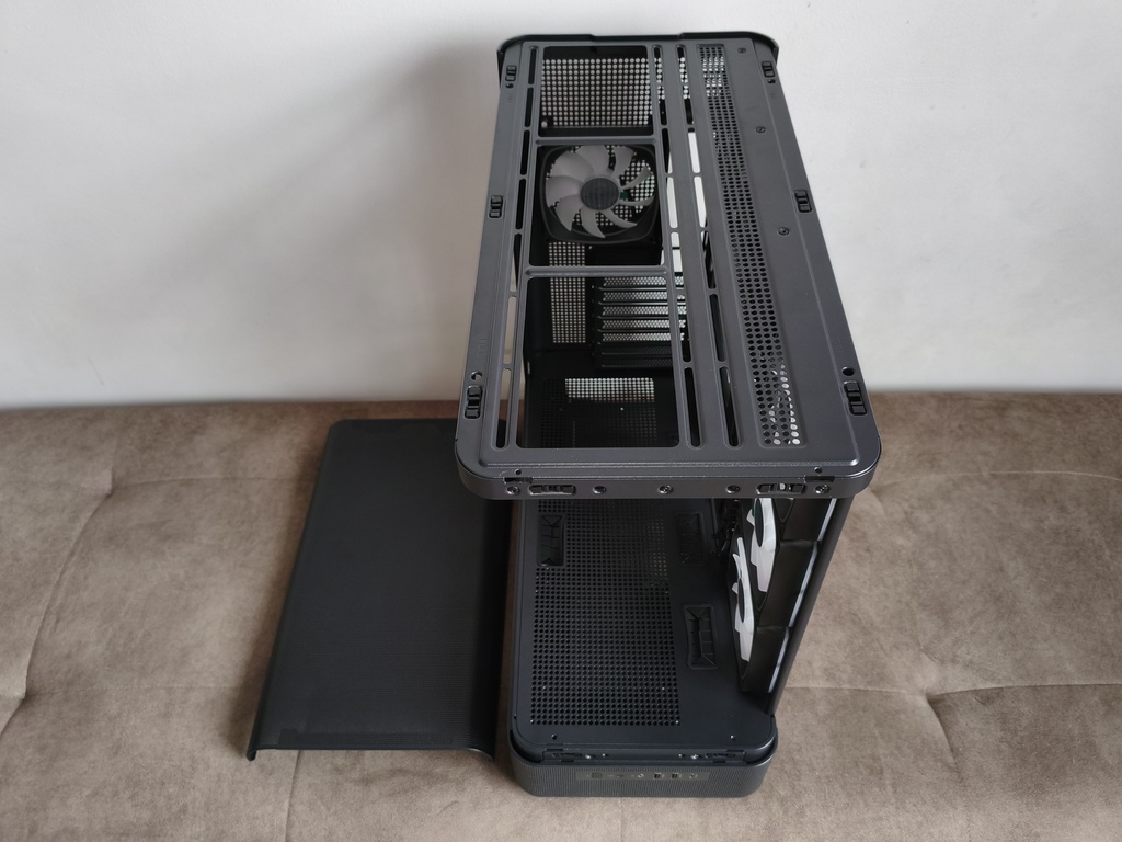 Górna część obudowy została przykryta metalowym panelem typu mesh, który można bardzo łatwo zdemontować. Zarówno panele boczne, jak i front, opierają się na systemie zatrzasków, co w praktyce pozwala na szybki dostęp do wnętrza bez użycia narzędzi.