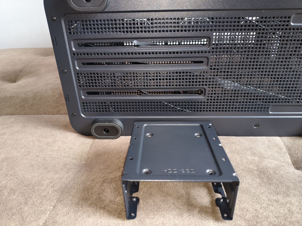 Montaż nośników danych również został dobrze rozwiązany. Na dole znajdziemy modułową klatkę HDD, którą można przesuwać, demontować lub relokować w zależności od potrzeb konfiguracji. Dodatkowo z tyłu tacki, w okolicach dużego wycięcia na backplate chłodzenia CPU, przewidziano miejsce dla dwóch dysków 2.5 cala, co w zupełności wystarczy dla większości współczesnych zestawów.