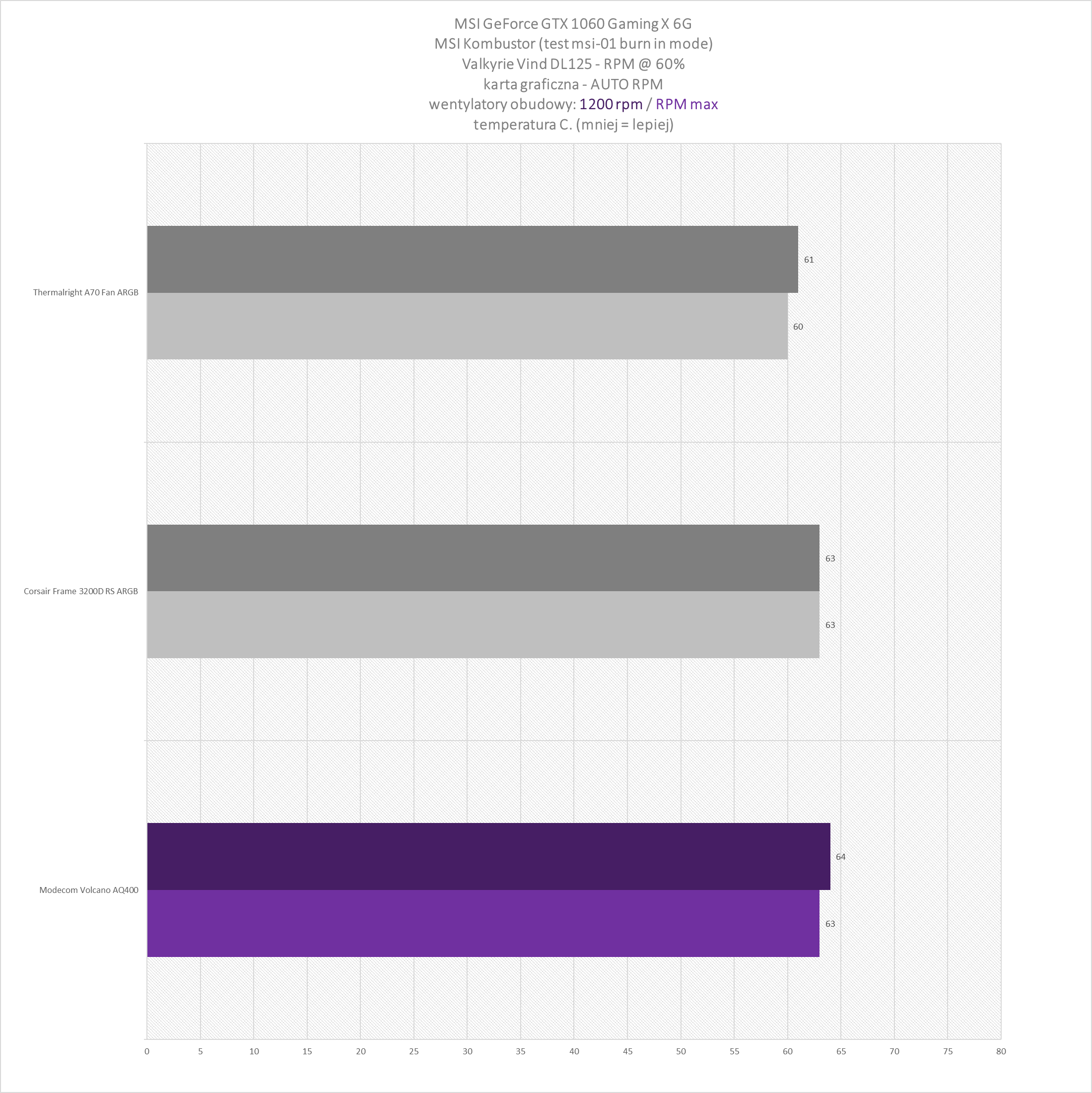 Wentylatory na karcie graficznej MSI GeForce GTX 1060 Gaming X 6G pracowały w dwóch trybach: automatycznym i ustawionym na stałe 60% RPM (w aplikacji Fan Control). Testy temperatur przeprowadzane były z wykorzystaniem benchmarku MSI Kombustor (rozdzielczość 1280 x 720).