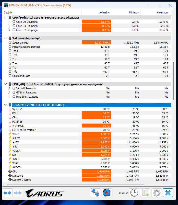 Lećmy dalej. Oba wentylatory na chłodzeniu powietrznym procesora Valkyrie VIND DL125 zostały ustawione w programie Fan Control na stałe 60% prędkości obrotowej, co przekłada się na około 1464 RPM maksymalnie (według odczytu w UEFI).