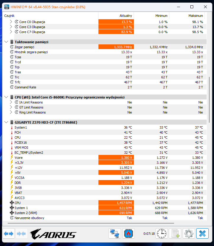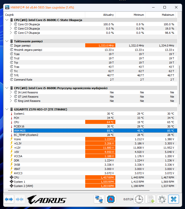 Po tym czasie zanotowałem do wykresu tę najwyższą osiągniętą temperaturę wśród ogólnie wszystkich rdzeni procesora i5-8600K.