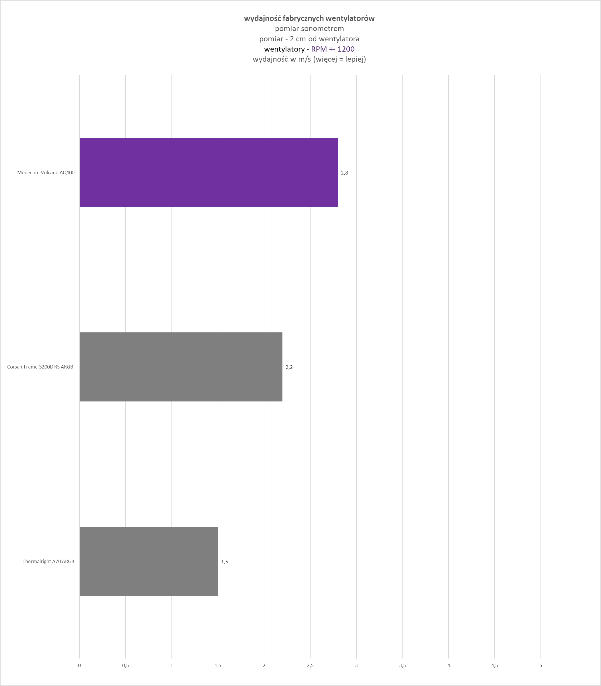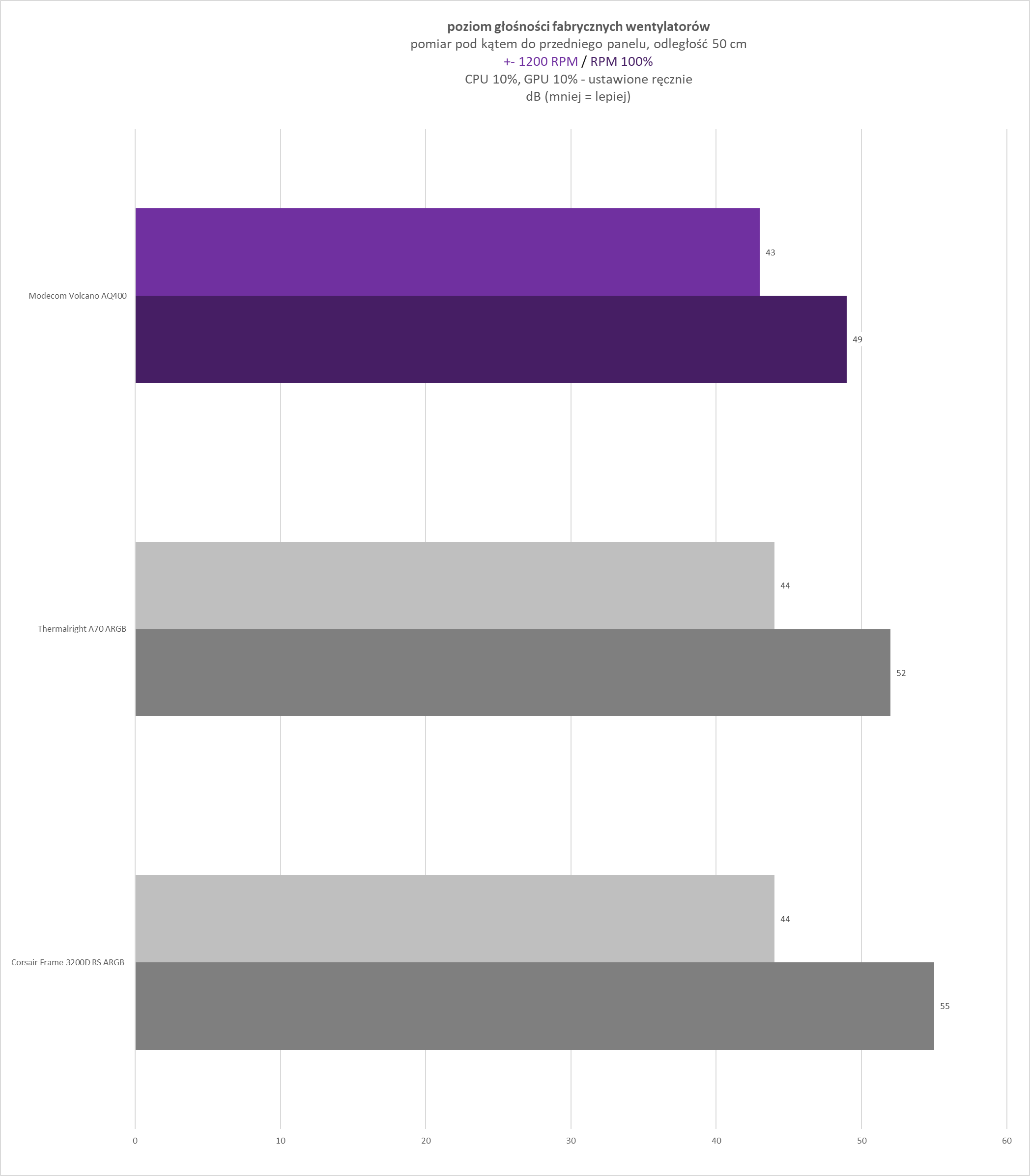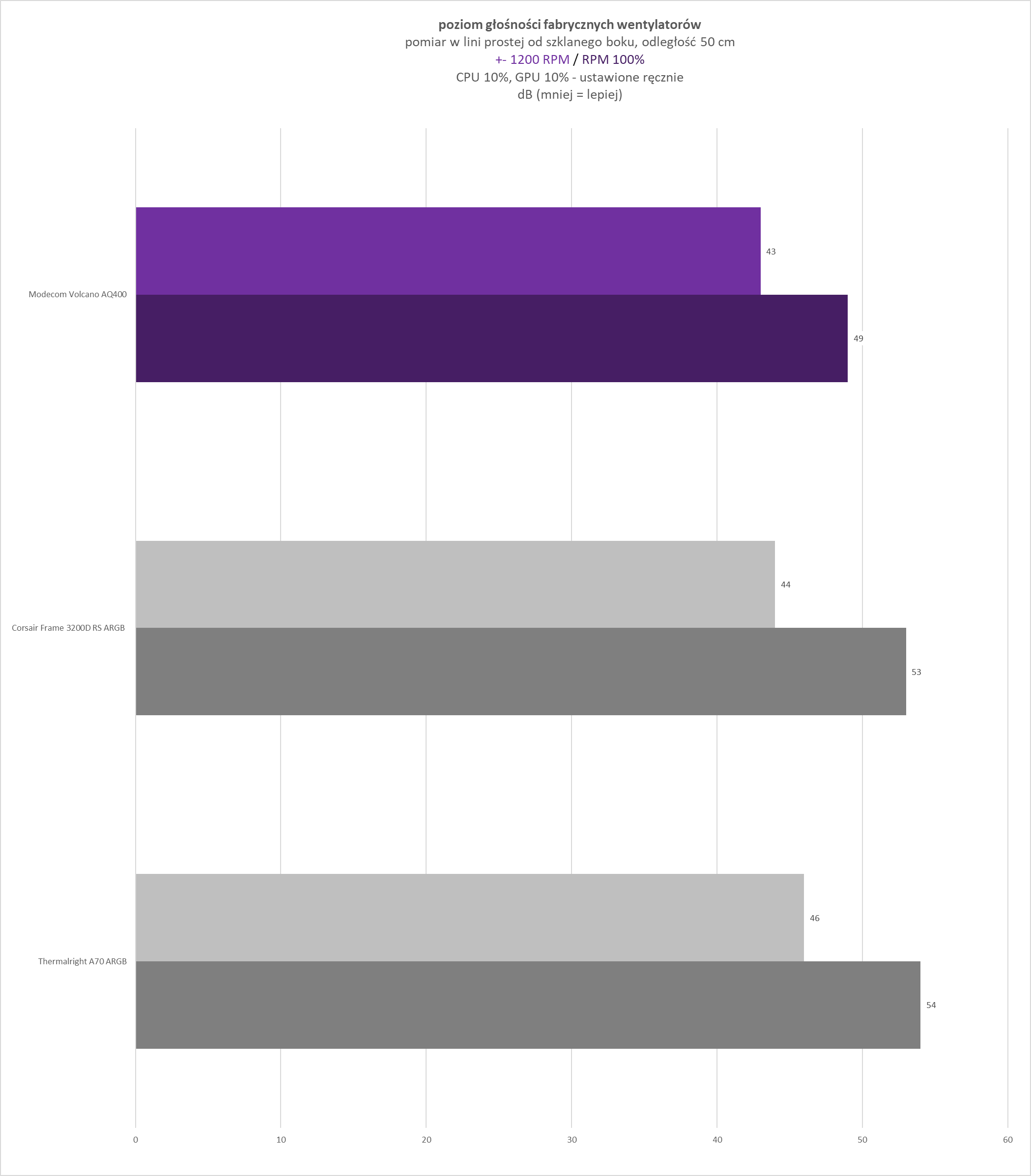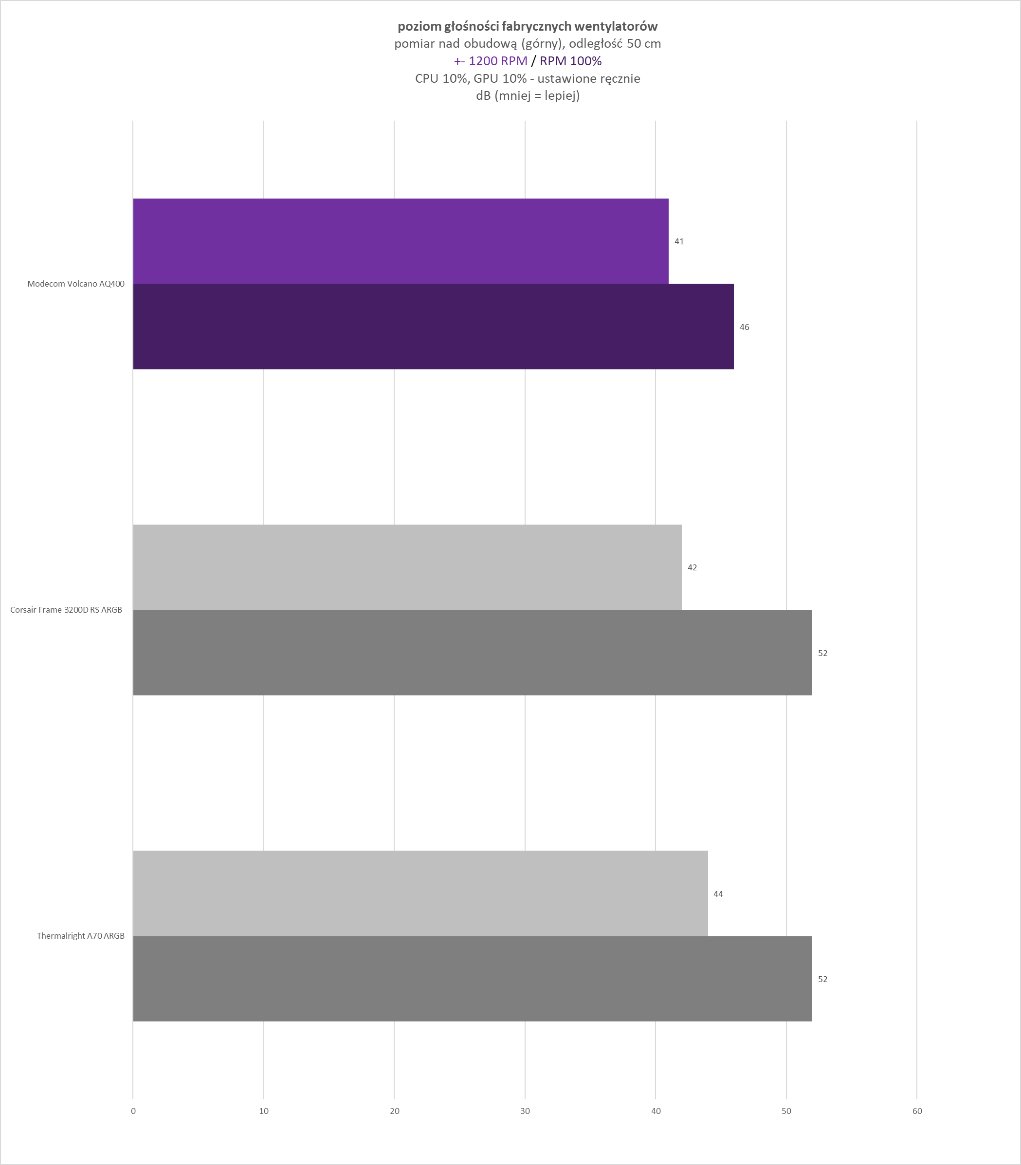 - stałe obroty ustawione na poziomie +- 1200 RPM (w zależności od wentylatorów jest to różny procent RPM) – ujednolicony punkt odniesienia, umożliwiający bezpośrednie porównanie wyników pomiędzy różnymi testowanymi obudowami
