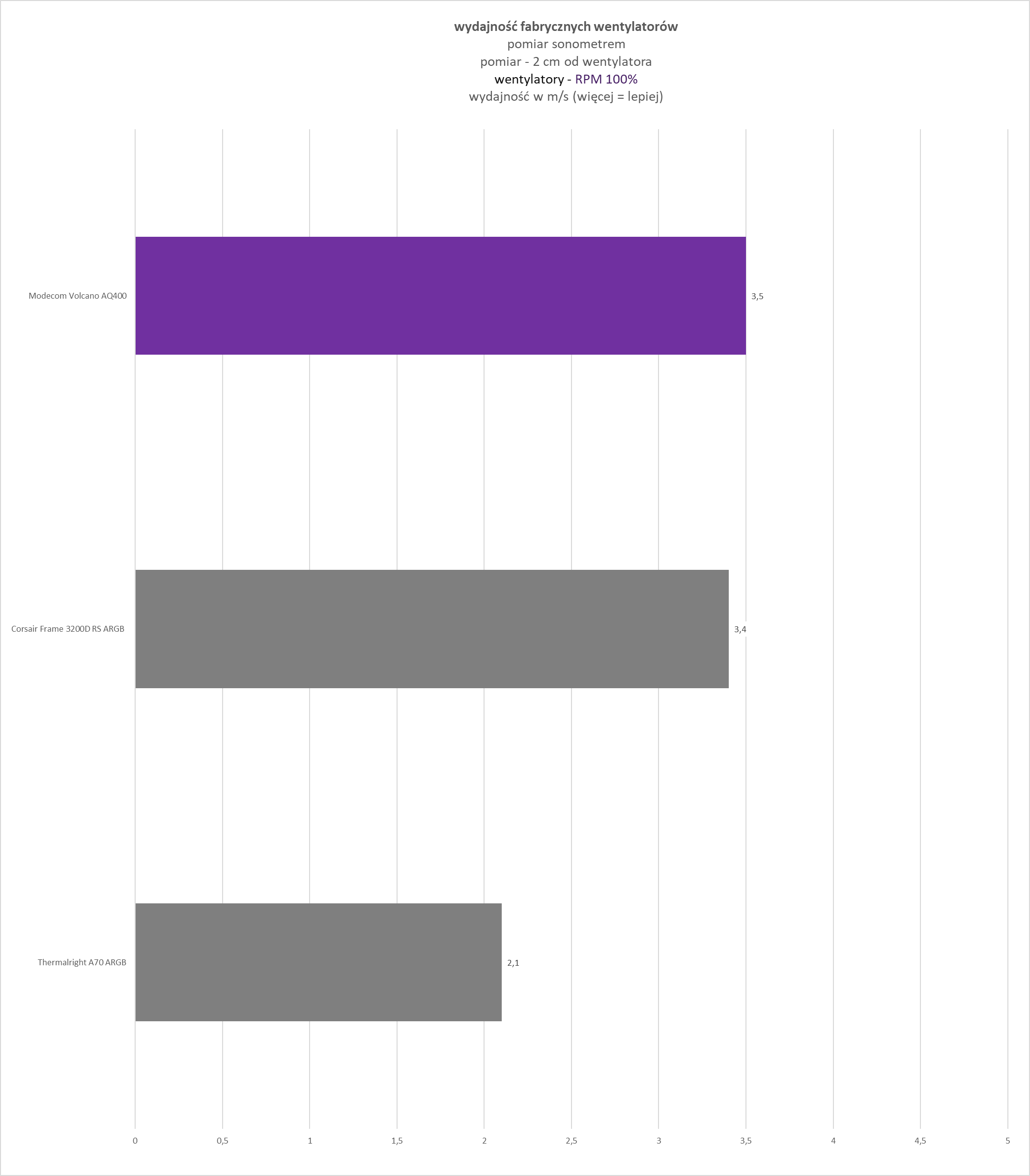 Kolejnym etapem testów (notabene nowo dodanym testem, zastosowanym pierwszy raz w teście obudowy Corsair Frame 3200D RS ARGB) jest weryfikacja wydajności wentylatorów zastosowanych w obudowie. Ma ona na celu określenie prędkości strumienia powietrza wytwarzanego przez pojedynczy wentylator (m/s).
