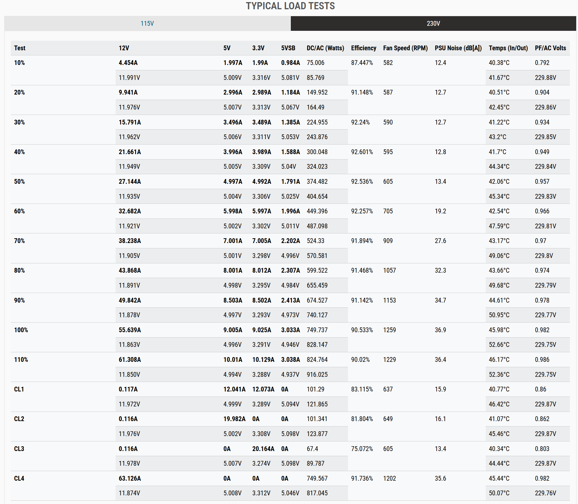 W testach Cybenetics uzyskał certyfikat Efficiency Gold oraz ocenę Noise A+, z efektywnością średnią na poziomie około 90,9 % i poziomem hałasu rzędu 19,6 dBA. Odchylenia linii +12 V nie przekroczyły 1,19 %, a tętnie napięć (ripple) w torach 12 V, 5 V i 3,3 V utrzymały się w bezpiecznych granicach — co dowodzi wysokiej klasy filtracji i stabilizacji sygnałów.