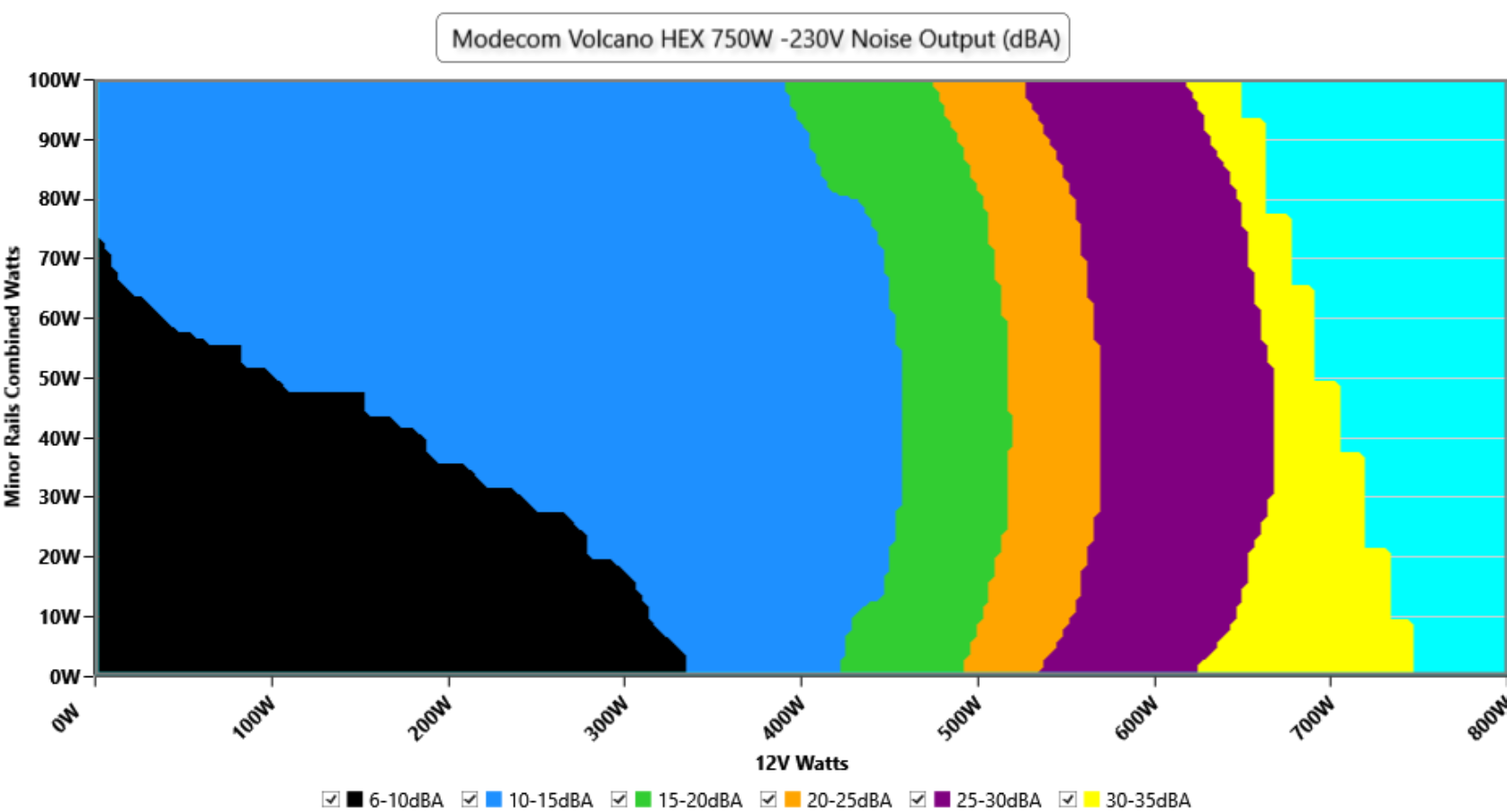 W praktyce te wyniki potwierdzają, że Volcano HEX 750W działa bardzo cicho przy umiarkowanym obciążeniu (~550-600 W), a jego pojedyncza linia 12V radzi sobie bez większych problemów w standardowych konfiguracjach gamingowych lub roboczych.