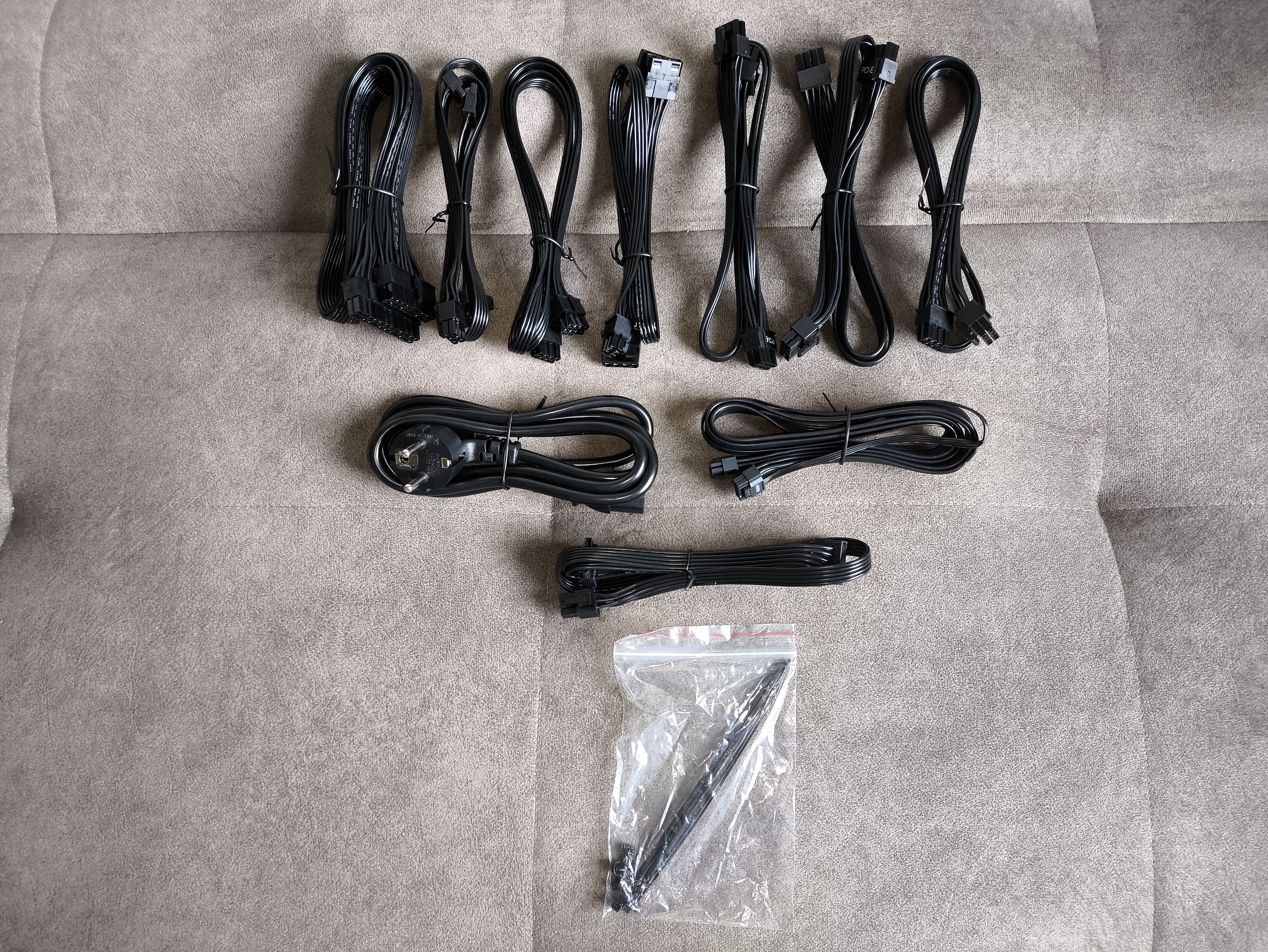 Wszystkie wiązki mają płaską konstrukcję, dzięki czemu łatwiej je poprowadzić za tacką montażową płyty głównej i zachować estetyczny wygląd wnętrza obudowy. Producent nie zdecydował się na oploty nylonowe ani termokurczliwe zakończenia, co jednak nie wpływa negatywnie na wygląd – całość utrzymano w jednolitej, czarnej kolorystyce.
