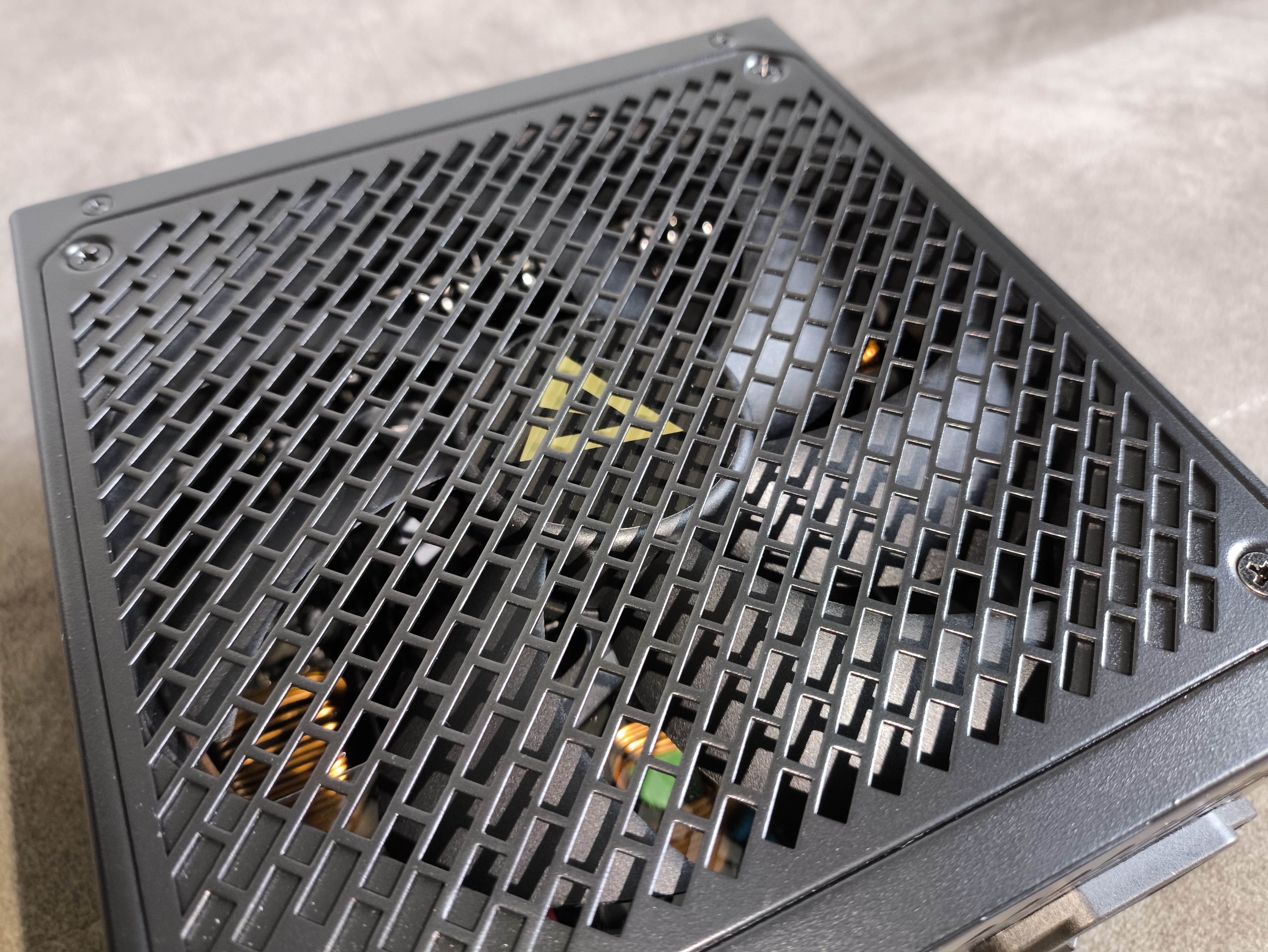 Tylna część obudowy prezentuje się równie dobrze – kratownica ma solidne rozmiary i zachowuje tę samą fakturę co górny panel, tworząc spójny, estetyczny projekt. Całość sprawia wrażenie dopracowanej i przemyślanej, a pod względem wykonania Volcano Hex 750W śmiało może konkurować z konstrukcjami z wyższej półki cenowej.