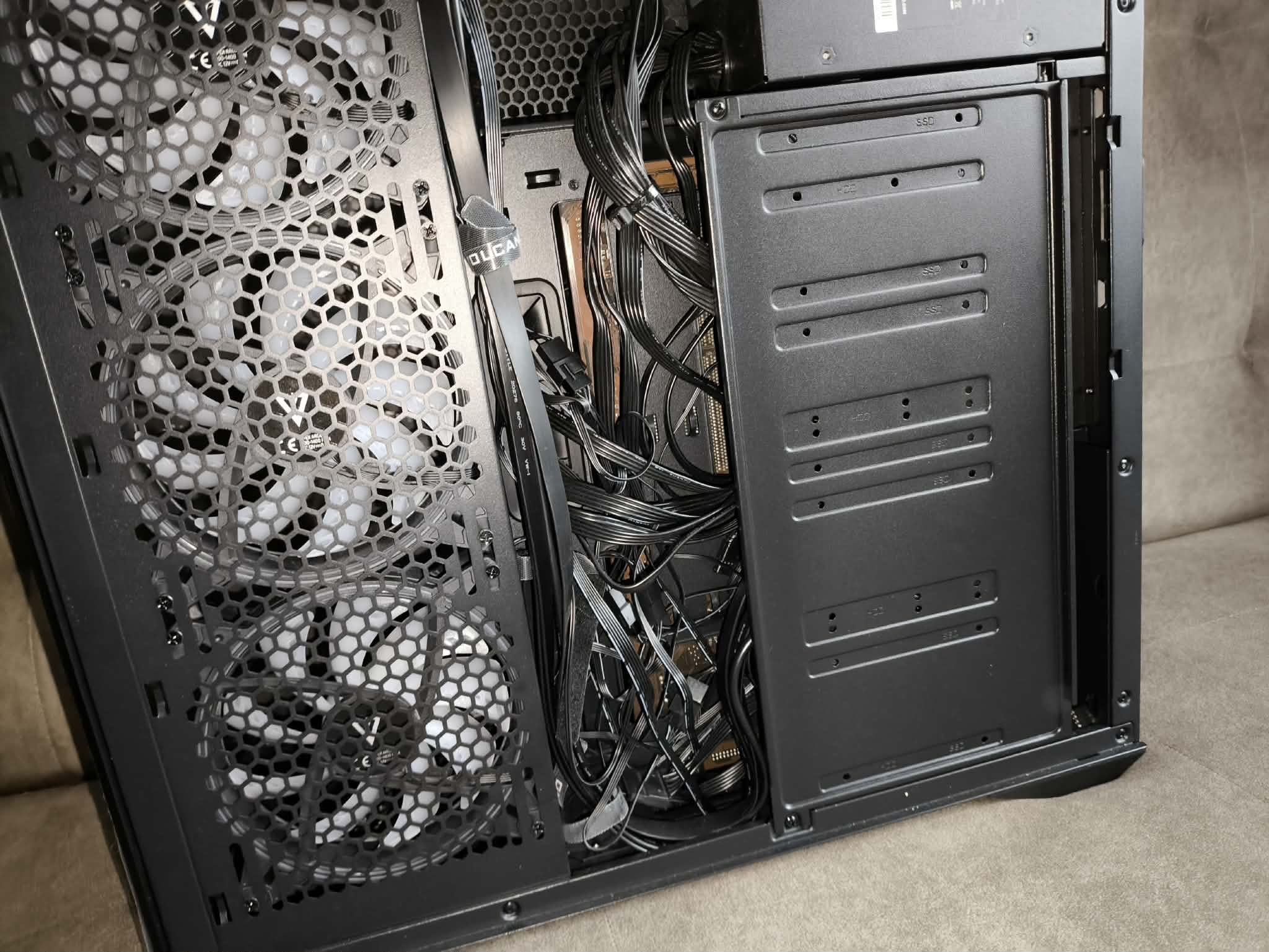 Jedynym drobnym minusem, wpływającym na idealne ułożenie wiązek, jest tylna płyta montażowa na nośniki danych, która po zamknięciu trochę ogranicza dostępną przestrzeń – czułem po sobie, że trzeba było użyć trochę więcej siły aby dokręcić obie śrubki.