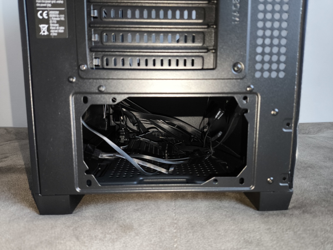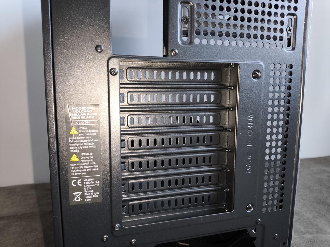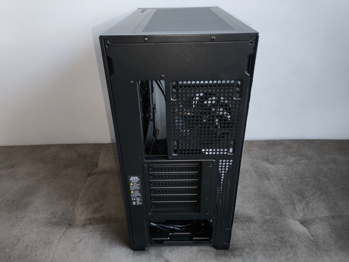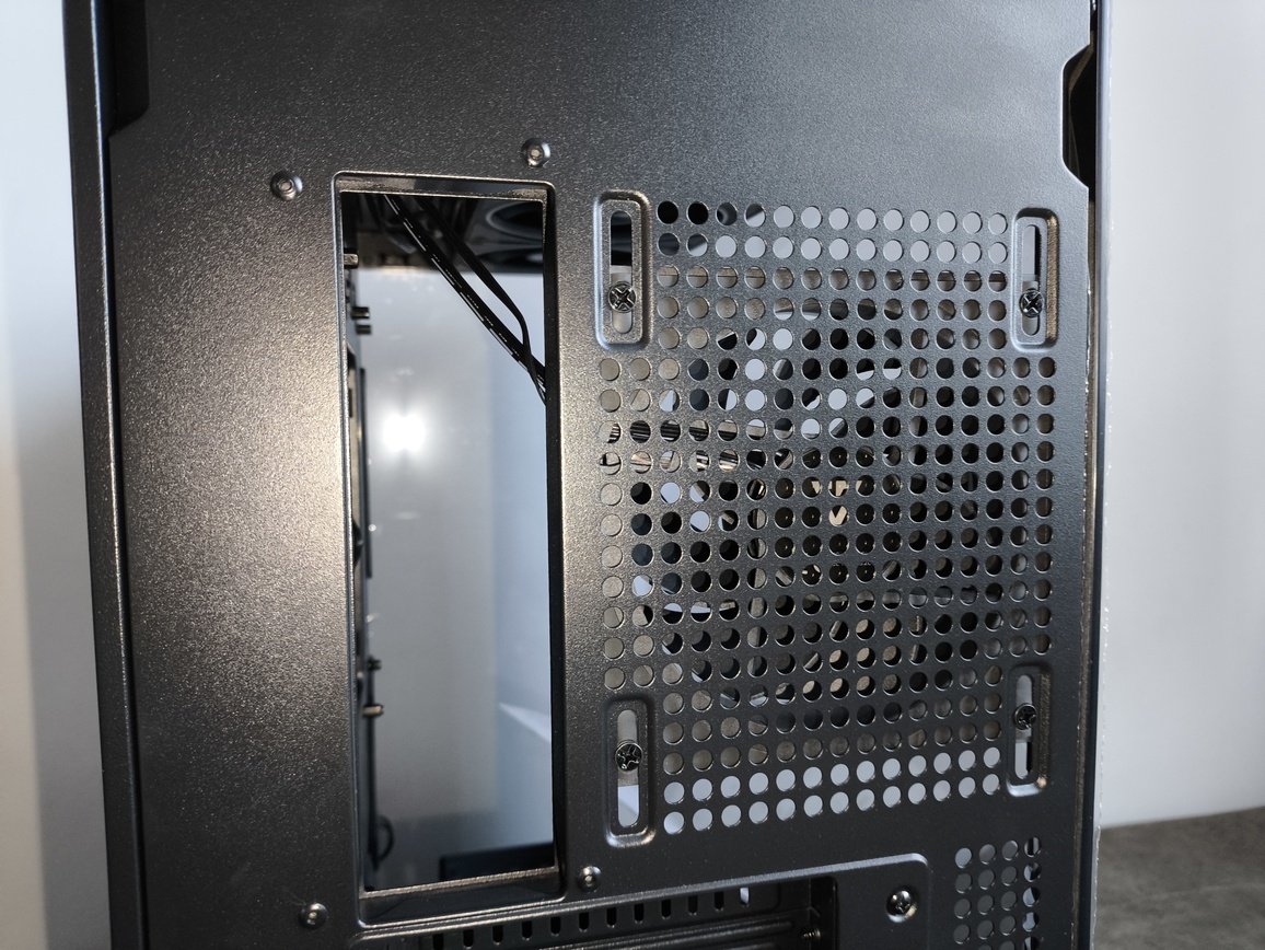 Tylny panel utrzymano w zgodzie z aktualnymi standardami. Znajdują się tu liczne okrągłe otwory wentylacyjne oraz siedem wykręcanych zaślepek PCI-e wyposażonych w poziome perforacje, poprawiające cyrkulację powietrza.