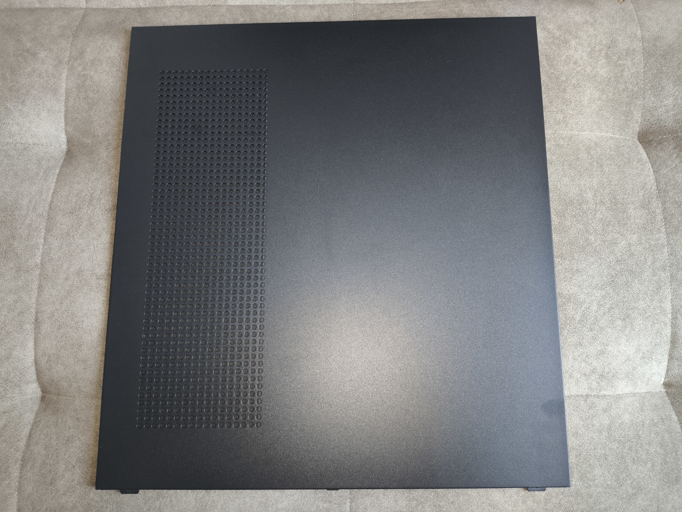 Prawy panel wykonano z dość grubego kawałka aluminium. Wyposażono go w pionową perforację odpowiadającą położeniu frontowych wentylatorów 120 mm. Dodatkowo zamontowano w tym miejscu magnetyczny filtr przeciwkurzowy. To się chwali.