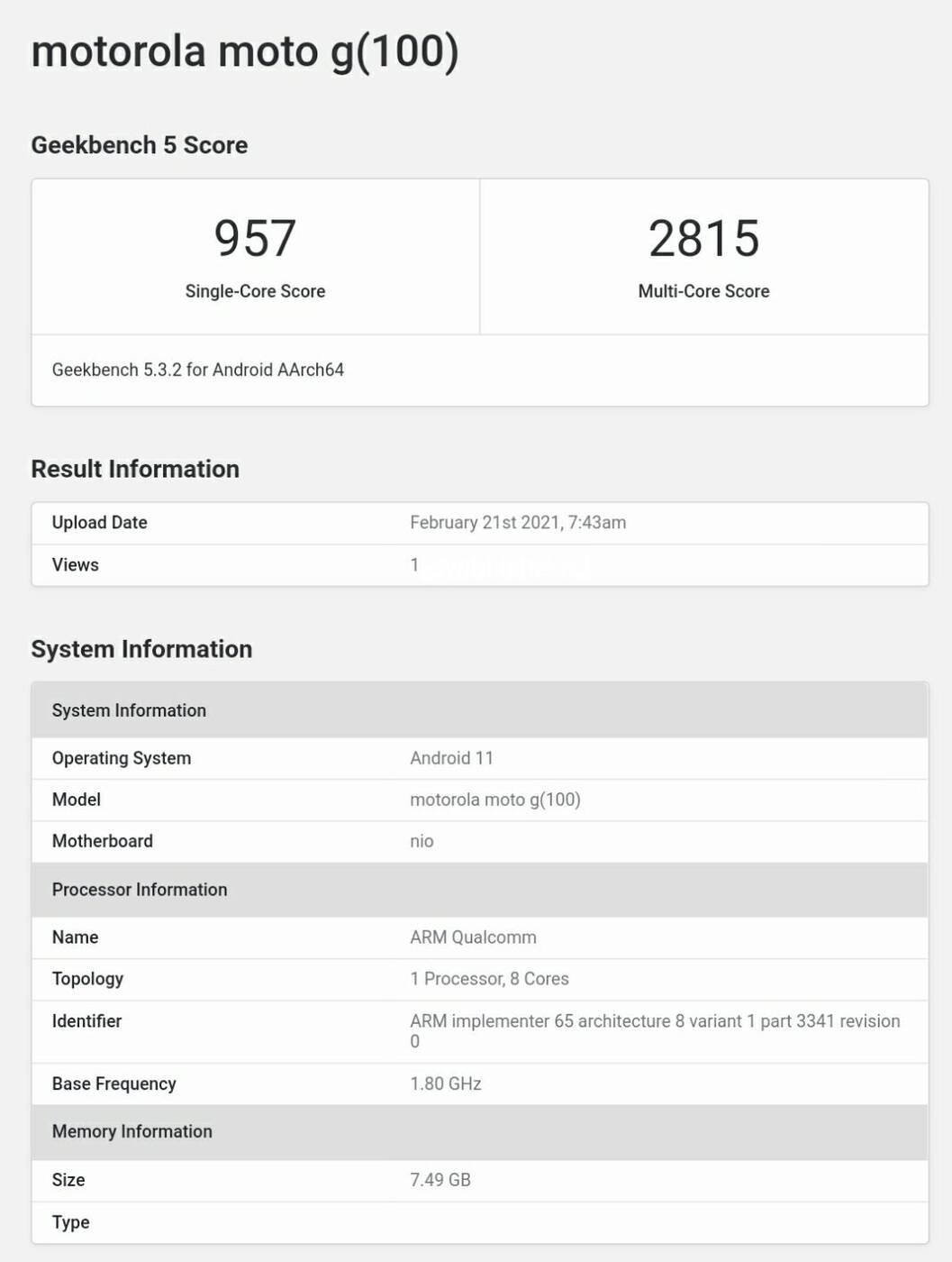 Nadany wcześniej dla Edge S kryptonim Nio pojawił się na liście Geekbech przy Motoroli Moto G100, co zdaje się potwierdzać przypuszczenia, że na europejskich rynkach ten smartfon będzie figurował właśnie pod tą nazwą. W bazie Geekbench pojawił się wariant telefonu z 8GB RAM i Androidem 11. Procesor Snapdragon 870 ma podstawową częstotliwość 1,80 GHz zaś maksymalną – 3,19 GHz.