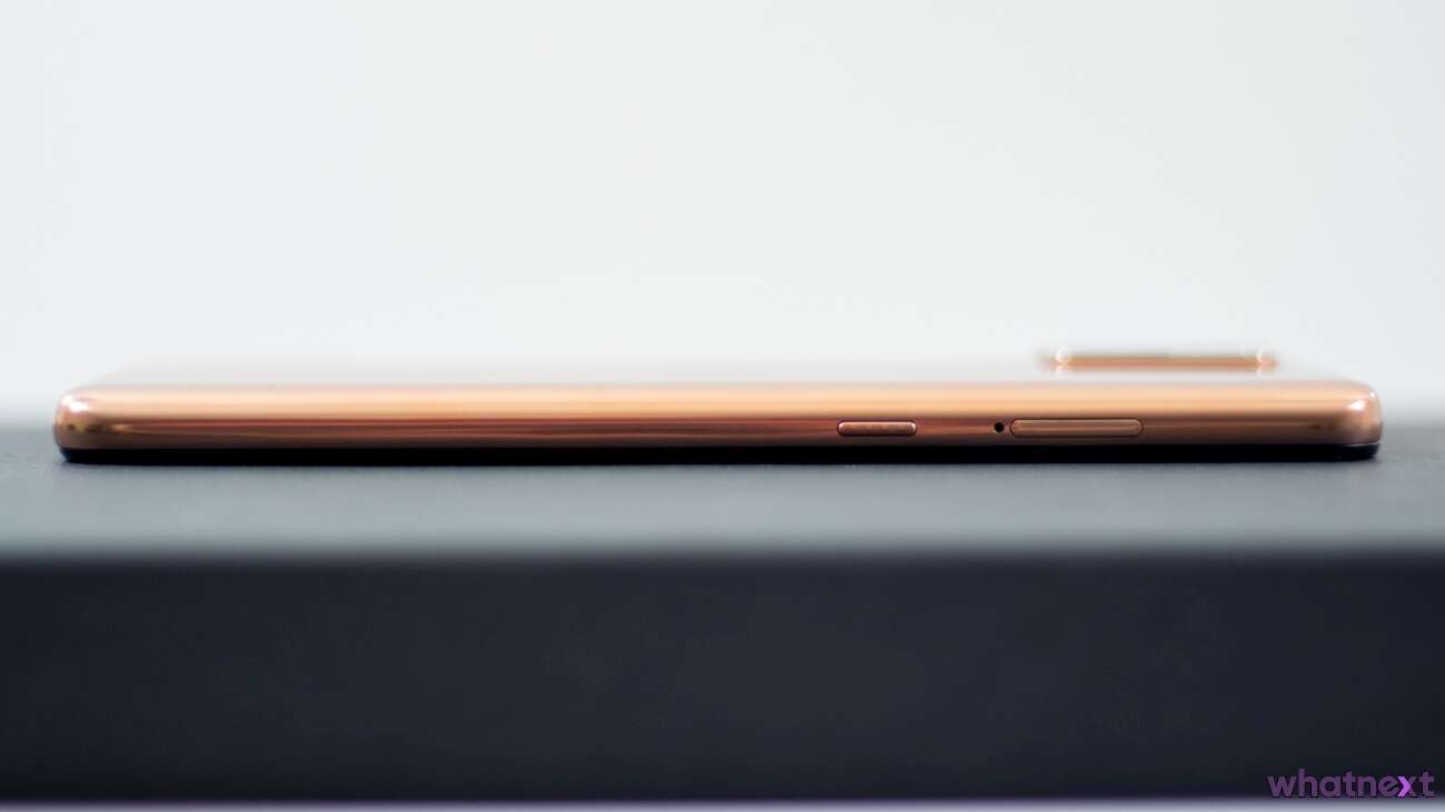 Na prawej krawędzi Moto G9 Plus znajdziemy z kolei tradycyjny „podwójny” przycisk regulacji poziomu głośności i mogłoby się wydawać, że zwyczajny przycisk on/off. Jest to jednak tylko złudzenie, bo w rzeczywistości na tym przycisku znalazł się też czujnik linii papilarnych, ułatwiając znacznie proces odblokowywania smartfona. Lewa krawędź skrywa z kolei tackę na dwie karty nanoSIM, z czego jeden slot jest też miejscem dla karty pamięci microSD do 512 GB.