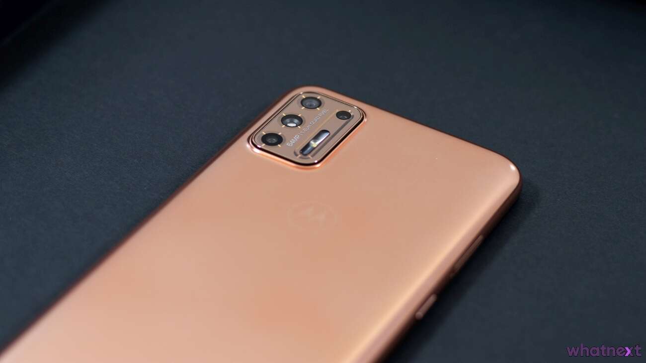 Pod kątem wykonania Moto G9 Plus składa się tak naprawdę z dwóch głównych elementów, a są to jednoczęściowe plecki z jakiegoś tworzywa sztucznego i ochrona wyświetlacza w postaci Panda Glass. Z tyłu smartfon sprawia wrażenie czegoś z wyższej półki za sprawą upchnięcia aż czterech obiektywów i podłużnej lampy błyskowej w prostokątnej sekcji w lewym górnym rogu. Odpowiednie logo jednak od razu zdradza producenta, który postarał się nawet o próbę wytyczenia nowego szlaku w kwestii zestawu przycisków.