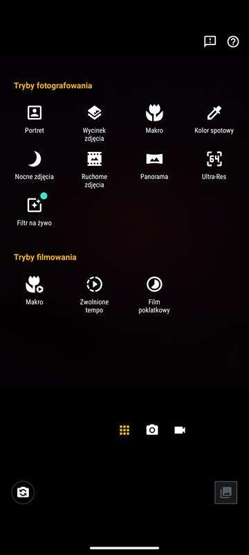 Po stronie aplikacji aparatu mamy do dyspozycji tradycyjny zestaw opcji na czele ze zwolnionym tempem w HD lub Full HD z kolejno 240 i 120 kl/s, trybem nocnym, zdjęciami makro, panoramą, trybem portretowym, obiektywem Google, wsparciem sztucznej inteligencji i możliwością ustawienia szerokiego spektrum rozdzielczości.