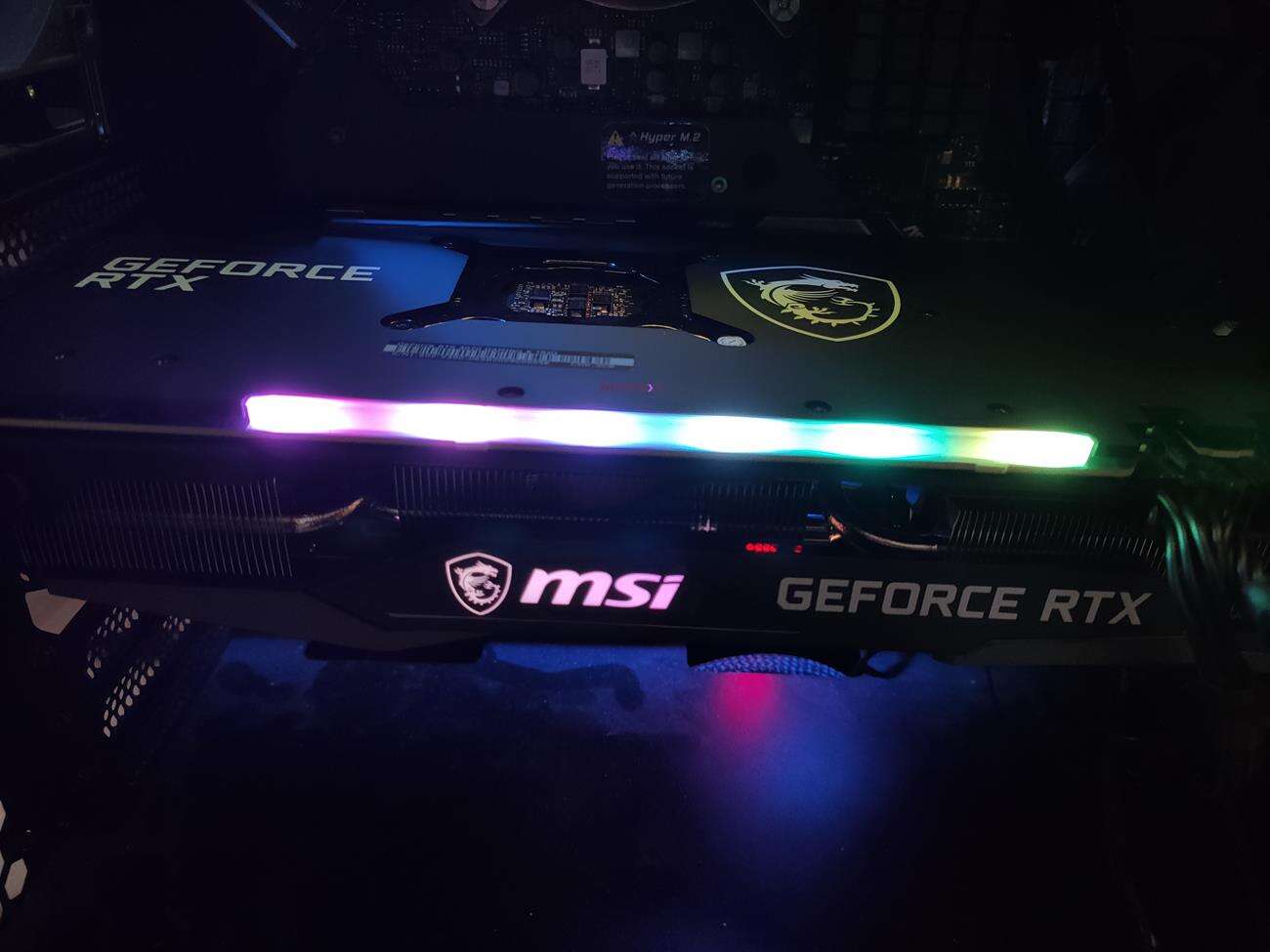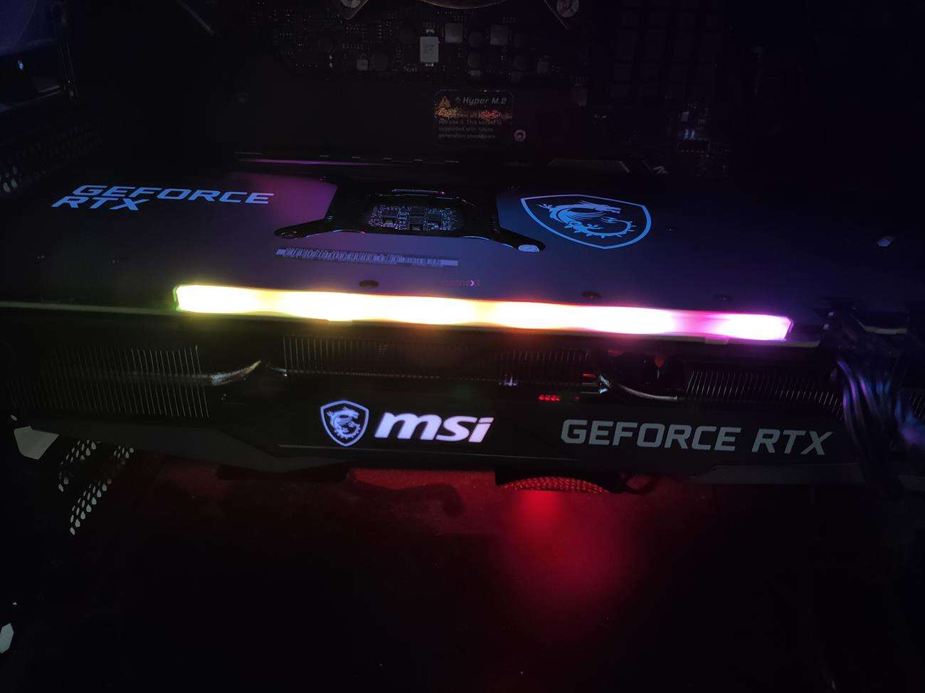MSI GeForce RTX 3070 Gaming X Trio wygląda bardzo dobrze. Radiator jest czarny, ale firma pomyślała o podświetleniu ARGB. Znajduje się ono obok wentylatorów oraz z boku. Można nim oczywiście sterować, więc w obudowie z oknem całość będzie nieźle się prezentowała.