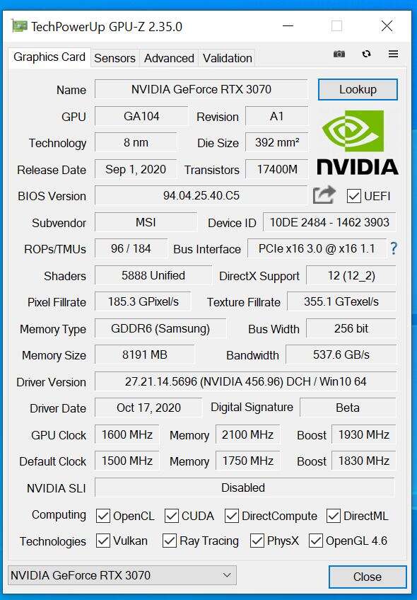 MSI GeForce RTX 3070 Gaming X Trio zasilana jest z dwóch złączy 8 pin. Rekomendowana moc zasilacza to 650 W. Dostępne wyjścia obrazu są następujące: 3x DisplayPort 1.4a oraz 1x HDMI 2.1. Całość jest także fabrycznie podkręcona – taktowanie boost to 1830 MHz. W benchmarku Metro Exodus 2560 x 1440 px karta miała średnie taktowanie równe 1951 MHz.