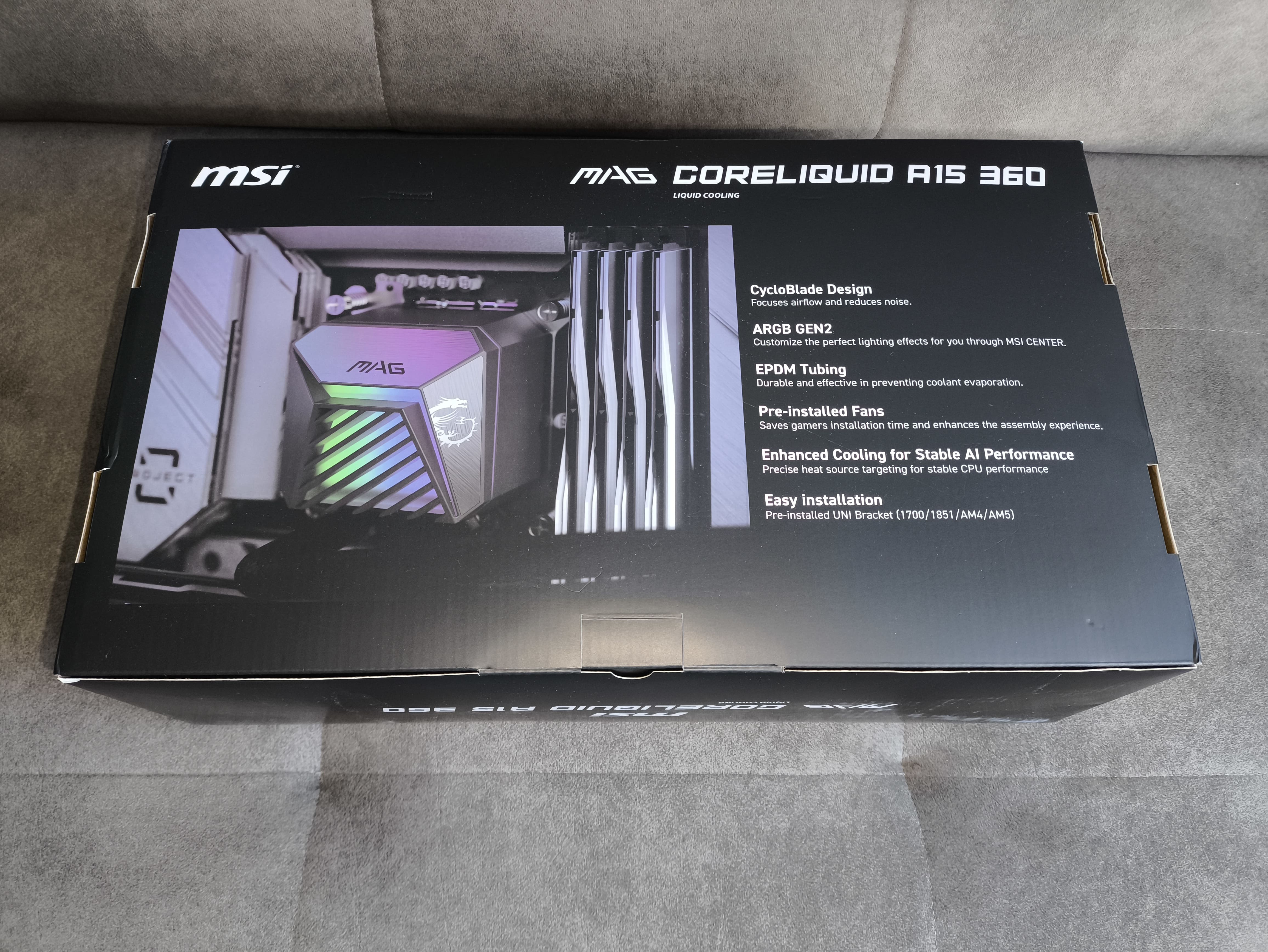 MSI MAG CoreLiquid A15 360 dostarczany jest do użytkownika końcowego w estetycznym, solidnym pudełku utrzymanym w ciemnoszarej kolorystyce. Na froncie producent umieścił pełnokolorową grafikę chłodzenia z podświetleniem ARGB, a także wyraźną informację o obecności zestawu montażowego kompatybilnego z podstawką LGA1851, co od razu przyciąga uwagę.