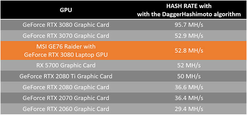 Na testowanym modelu z Intel Core i9-10980HK udało się osiągnąć 52,8 MH/s. Zestaw pracował z koparką Excavator z algorytmem DaggerHashimoto. Wydajność jest więc większa od RTX 2080 Ti, ale odbiega od stacjonarnego RTX 3080.