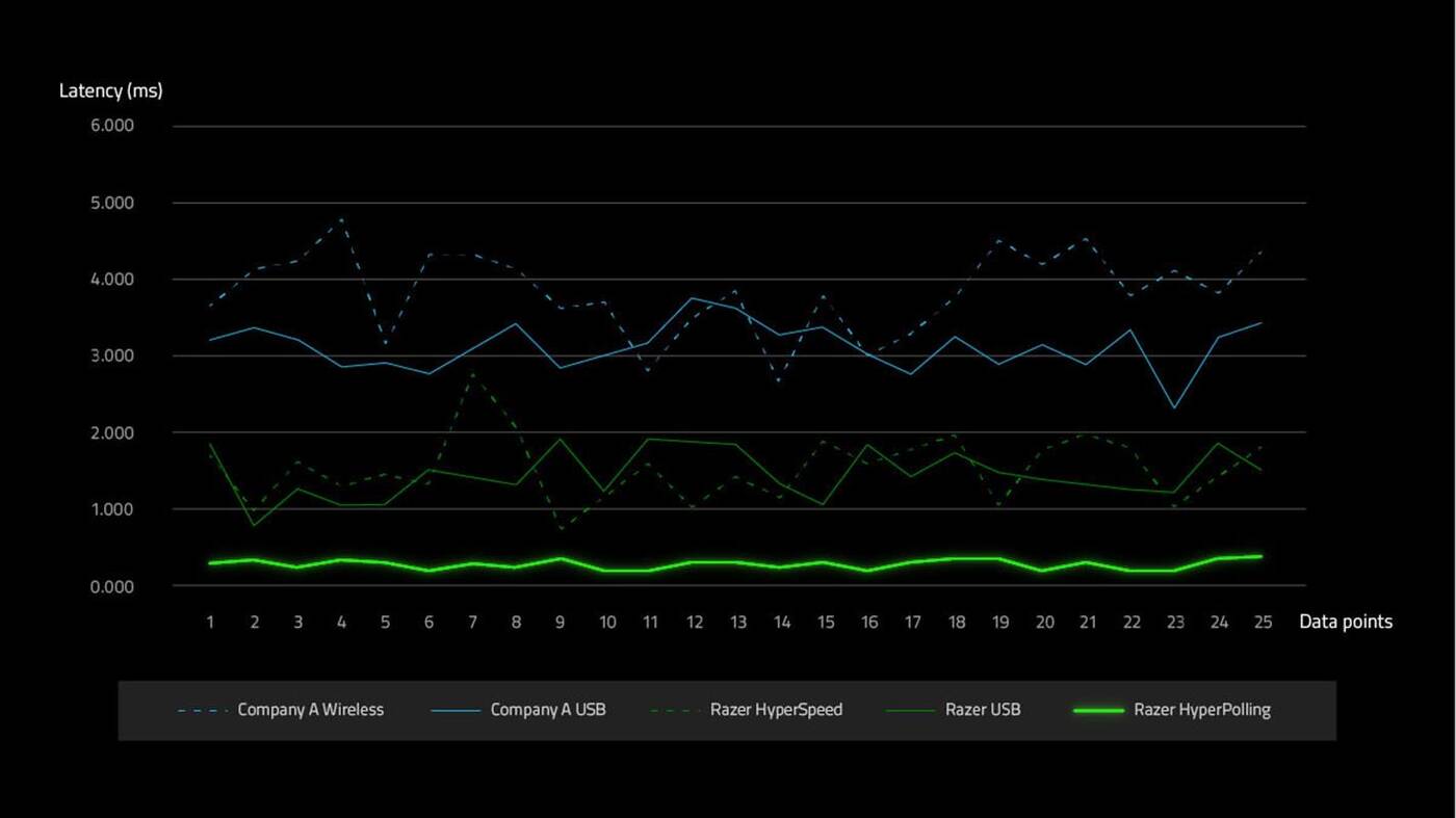 Technologia Razer HyperPolling wykorzystuje szybki mikrokontroler USB, aby przewyższyć standard 1000 Hz i podbić go ośmiokrotnie z Razer Viper 8 kHz. To skutecznie zmniejsza opóźnienie wejściowe z 1 ms do zaledwie 1/8 milisekundy, co zapewnia nie tylko najniższe opóźnienie kliknięcia, ale także ogranicza odchylenie od kliknięcia do kliknięcia do absolutnego minimum.