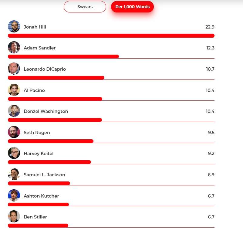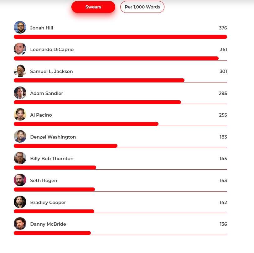 Cóż, w tym wypadku złoty medal wędruje do Jonaha Hilla, który w swoich filmach użył aż 376 wulgaryzmów, które przekładają się na 22,9 przekleństw przypadających na 1000 wypowiedzianych słów. Tak, Hill przoduje w obu tych kategoriach. Jeśli liczyć ogół wulgaryzmów to zaraz za nim plasuje się Leonardo DiCaprio (361) i Samuel L. Jackson (301). Jeśli zaś popatrzymy na ilość inwektyw przypadających na 1000 słów za Hillem mamy Adama Sandlera (12,3) i Leonardo DiCaprio (10,7).