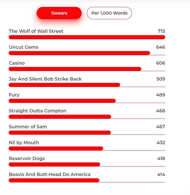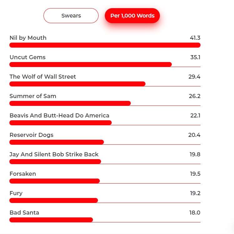 Zadziwia więc zwycięzca zestawienia na najbardziej wulgarny film, bowiem na czele z liczbą 715 przekleństw w ciągu 180 minut znajduje się Wilk z Wall Street, a zaraz za nim Uncut Gems, w którym usłyszymy 646 przekleństwa w ciągu seansu.  Tę kategorię podzielono na ilość wulgaryzmów użytych w całym filmie i na to, ile przypada ich na 1000 wypowiedzianych na ekranie słów. W tej drugiej kategorii zwycięzcą jest Nil by Mouth. W debiucie reżyserskim Gary’ego Oldmana przypada ich aż 41,3.