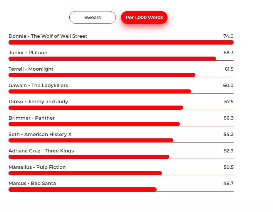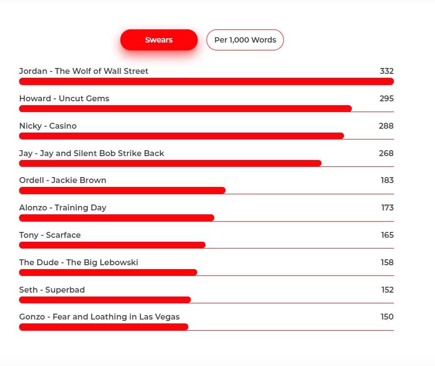 I ostatnia kategoria, również podzielona według dwóch kryteriów. Tutaj znowu na podium jest Wilk z Wall Street.  Najwięcej przeklina Jordan, który użył w filmie aż 332 przekleństw, zaś Donnie na 1000 wypowiedzianych słów używał aż 74 wulgaryzmy!