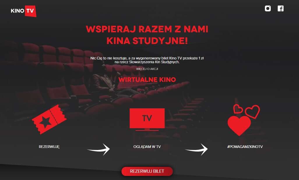 Kanał telewizyjny Kino TV zwraca uwagę na trudną sytuację branży kinowej i wspólnie z widzami postanawia wesprzeć kina studyjne i lokalne w tym wymagającym czasie. W ramach akcji #pomagamzKinoTV rusza dedykowana strona internetowa umożliwiająca bezpłatną rezerwację symbolicznych biletów na domowe seanse „Filmów Twojego życia” na Kino TV. Za generowane bezkosztowo dla użytkowników bilety, stacja przekaże po 1 zł na rzecz Stowarzyszenia Kin Studyjnych. Bilety dostępne na stronie https://pomagam.kinotv.pl/.