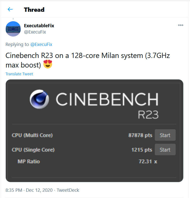 AMD szykuje nowe procesory EPYC Milan. Najmocniejszy z nich będzie miał 64 rdzenie i 128 wątków. Dwie takie konstrukcje zostały umieszczone na jednej płycie i przetestowane w Cinebench R23. Uzyskany wynik to 87878 punktów, czyli bardzo dużo, choć na pewno potencjał jest większy. Oprogramowanie też musi zostać odpowiednio dopracowane i wtedy uzyskany wynik może się jeszcze zwiększyć.
