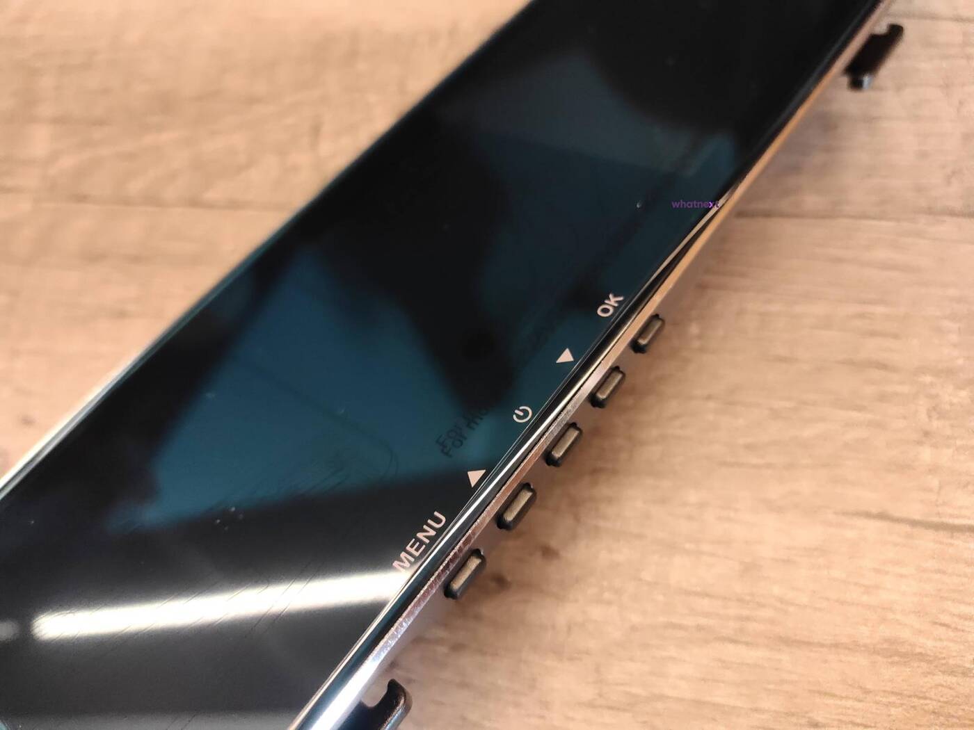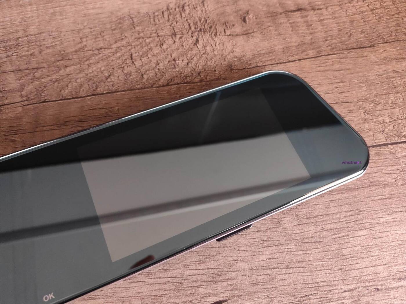 Na dolnej krawędzi znajdziemy z kolei centrum dowodzenia, a więc przycisk on/off, menu, góra, dół oraz przycisk potwierdzenia. Innymi słowy – tradycja, jak na wideorejestrator przystało. To, co nie jest zupełnie tradycyjne w tym modelu, do sposób montażu, ponieważ sprowadza się on do naciągnięcia dwóch z czterech dołączonych gumek na widełki znajdujące się na tyle MR155 NV wzdłuż lusterka wewnętrznego. Chociaż brzmi to prosto, to może przysporzyć nieco frustracji, ale kiedy już uda nam się sprostać wyzwaniu, będziemy mogli cieszyć się zupełnie nowym, zapewne większym lusterkiem wewnętrznym.