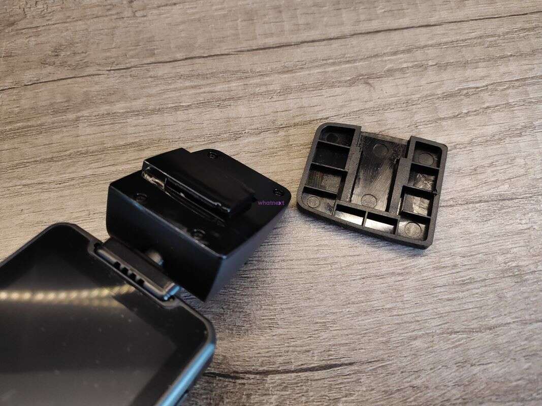 Sam uchwyt jest banalny w swojej konstrukcji, posiadając wyłącznie złącze microUSB do zasilania i prosty mechanizm regulacji wideorejestratora góra-dół i na boku, choć dosyć skromnie. Należy wyróżnić w nim nietypowy dodatek drugiej 180 mAh baterii, która znalazła się też w wideorejestratorze. Oba ogniwa nie są zbyt wytrzymałe, ale umożliwiają nagrywanie kluczowych materiałów na parkingu, kiedy system wykryje, że ktoś w nas uderzył.