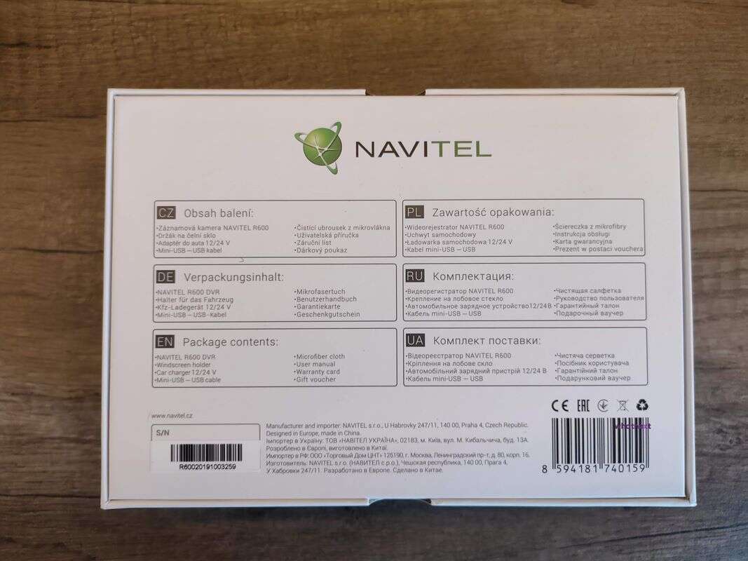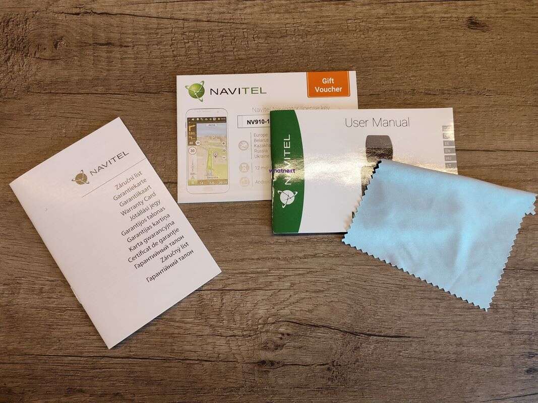 Charakterystyczne dla Navitel kartonowe pudełko-szkatułka, skrywa w sobie tradycyjnie to wszystko, co zwykle znajdziemy w zestawie z wideorejestratorami tej firmy. Jest więc karta gwarancyjna, instrukcja obsługi, kod na 12 miesięcy subskrypcji w nawigacji producenta, ściereczka z mikrofibry, jak również sam wideorejestrator, ładowarkę samochodową, przewód USB-A do miniUSB, uchwyt do montażu na szybie z zapasową podkładką i jeszcze jedną zapasową taśmę montażową.