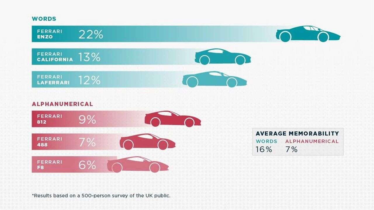Dalszy eksperyment wykazał, że pojazdy takie jak Enzo, LaFerrari i California od Ferrari okazały się znacznie bardziej rozpoznawalne niż modele pokroju 812, 488 i F8. Nic dziwnego, jako że tego typu pojedyncze słowa są często po prostu w czymś ugruntowane, nawiązując do rzeczywistych obiektów.