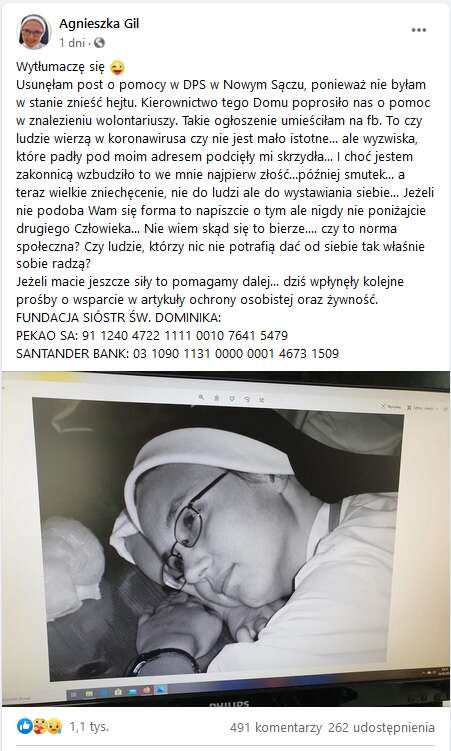 Apel został wystosowany przez Agnieszkę Gil, znaną jako Siostra Tymoteusza z zakonu Dominikanek, która pracuje w jednym z lokalnych DPS-ów w Nowym Sączu. Nie przetrwał on długo, bo Siostra nie wytrzymała fali hejtu, która się pojawiła pod postem na Facebooku.