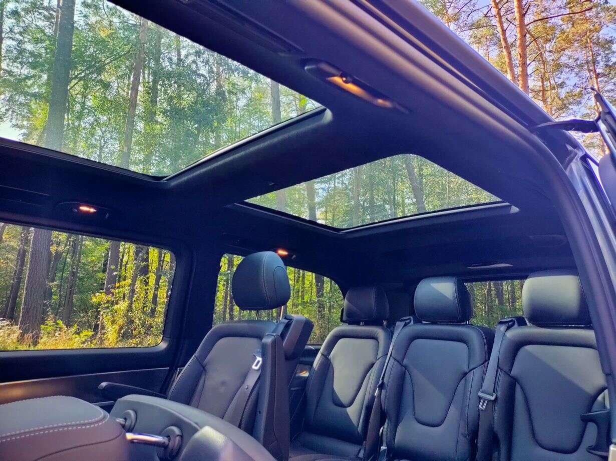 Wyposażenie, jakie oferuje Mercedes V 300d jest wręcz bliskie temu, które posiadają topowe limuzyny producenta. Mam tu na myśli dużą lodówkę, która została umieszczona w podłokietniku. Podróż umila szesnasto głośnikowy zestaw audio Burmester, który nastawiony jest głównie na tony wysokie i średnie, aczkolwiek miękki bas również się znajdzie. Co jeszcze? Ogrzewane i chłodzone cup holdery, także chłodzone i ogrzewane fotele. Adaptacyjne zawieszenie? Mówisz, masz. Duży dach panoramiczny? Jest. Klimatyzacja trzystrefowa? Żaden problem. Ogrom schowków? Oczywiście. Kamera 360 oferująca wysoką rozdzielczość? Owszem, jest. Ogrzewanie postojowe również znalazło się na długiej liście wyposażenia. Jedyna rzecz, która zaskakuje to dość słaba ilość portów USB. Co ciekawe, zabrakło mi USB typu A. Znalazłem dwa typu C. Zaskoczyło mnie to, że w przypadku oświetlenia ambiente mamy do dyspozycji tylko trzy kolory. Tak, to czepianie na siłę, ale jednak!