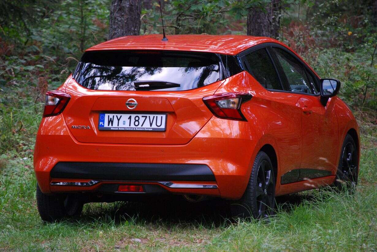 Mimo, iż japoński mieszczuch ma już 4 lata, czyli nie jest już najświeższym modelem na rynku, nadal broni się swoim wyglądem. Przód wyprofilowany jest zadziornie, agresywnie. Maska opada w dół pod dużym kątem, co komponując się z długimi lampami przednimi, dobrze wpisującymi się w koncepcję wyglądu całego samochodu. Piękny, metaliczny, pomarańczowy lakier w testowym egzemplarzu potęgował całościowy efekt. Sprytnie ukryte klamki w tylnych drzwiach także przyzwoicie komponowały się w bryle samochodu. Dodatkowo, czarne wstawki na drzwiach czy przy tylnej szybie oraz 17-calowe czarne felgi dodają Nissanowi Micra dodatkowego pazura. Reasumując, wygląd Nissana Micry oceniam pozytywnie. Całość bryły samochodu jest spójna, ciężko jest się doszukać na niej elementu, który by rażąco nie pasował.