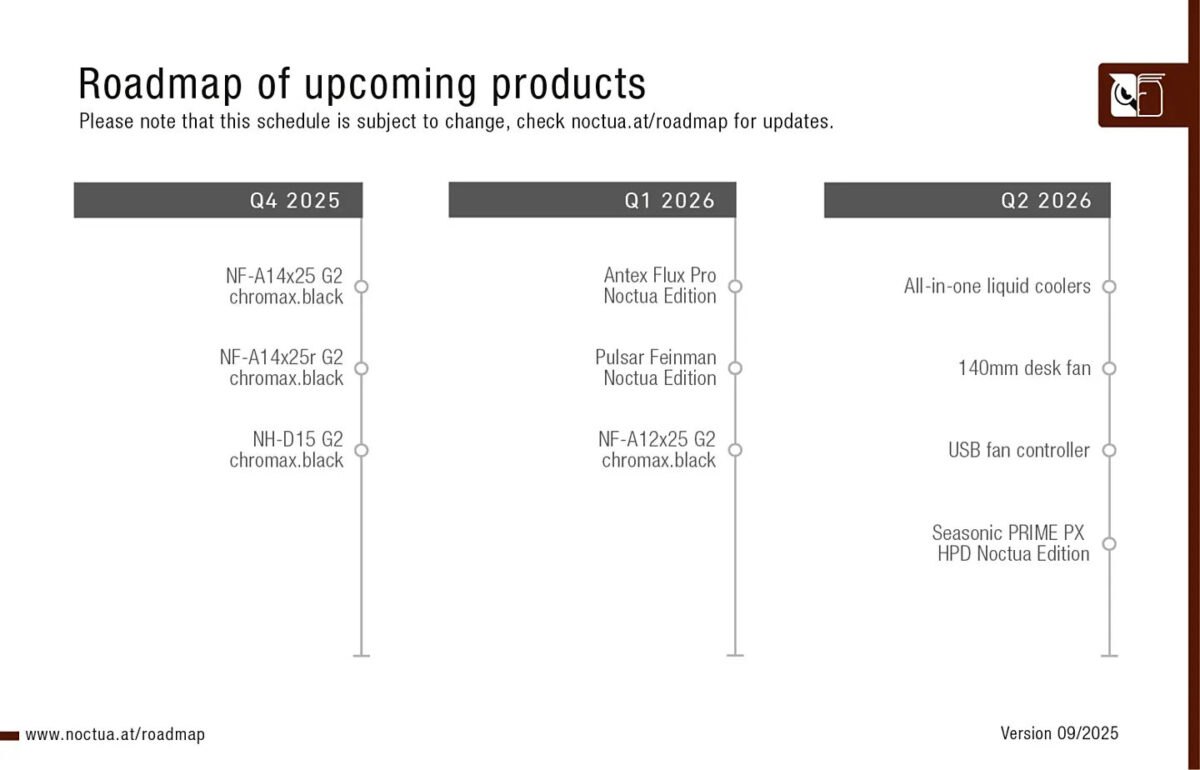 Mapa produktowa ujawnia także przesunięcia w innych liniach. NH-D15 G2 oraz NF-A14x25 G2 w wersji chromax.black, pierwotnie planowane na trzeci kwartał 2025 roku, zadebiutują dopiero w czwartym kwartale. Z kolei NF-A12x25 G2 chromax.black zostały przesunięte na pierwszy kwartał 2026.
