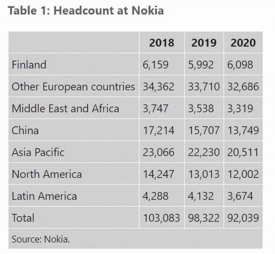 Najnowszy raport roczny mówi, że w 2019 roku zwolniono 5000 osób, a ponad 6000 osób w zeszłym roku. Oznacza to, że liczba pracowników Nokii w 2020 roku wynosiła 92039 osób.