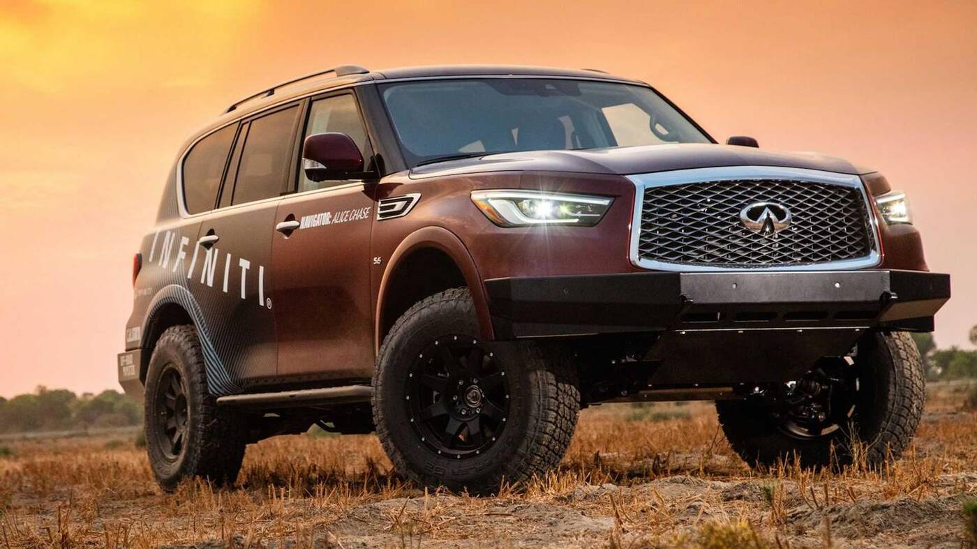 Chcielibyśmy powiedzieć, że QX80 był tak naprawdę fabrycznym modelem Infiniti na 2021 rok modelowy, ale tak nie było. Ten SUV zyskał większy o trzy cale prześwit, elementy zawieszenia terenowego, niestandardowe zderzaki, wytrzymałe wahacze, grubsze osłony podwozia i masywne opony terenowe.