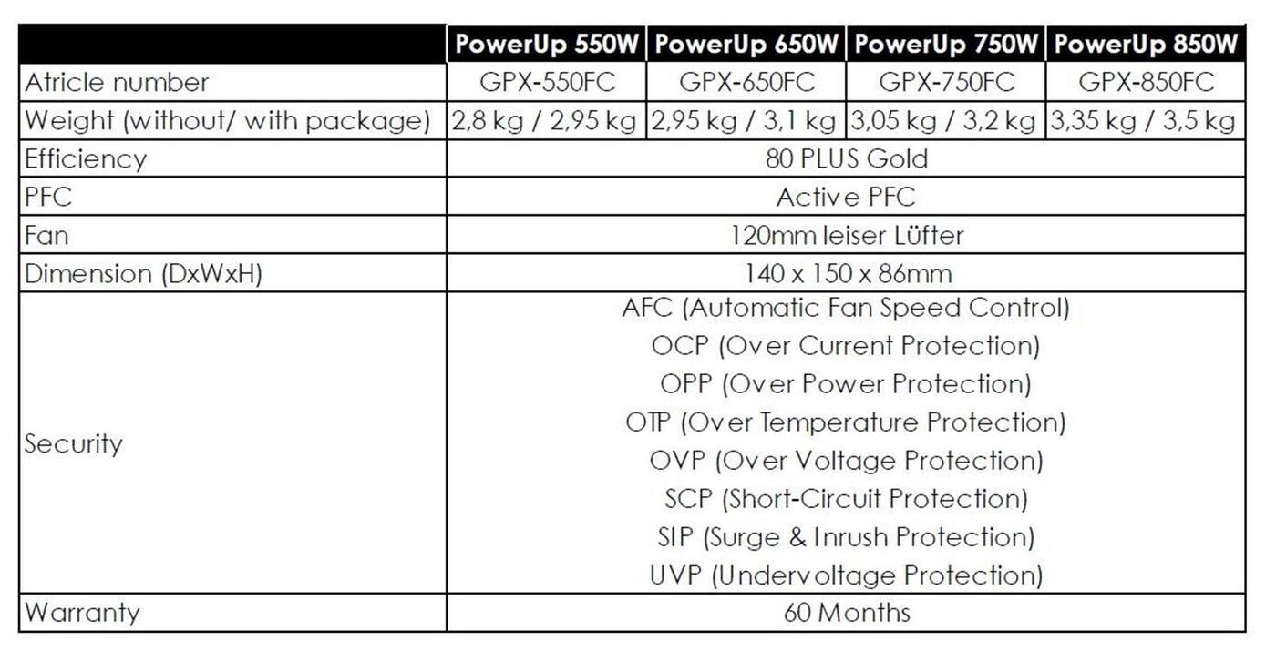 Zasilacze z serii PowerUp łączą ponoć wysoką jakość wykonania i zaplecza technologicznego z wysoką wydajnością. Są dostępne w wersjach o mocy 550, 650, 750 i 850 W, nad którymi pieczę stanowi certyfikat 80 Plus Gold, a zmieszczą się praktycznie wszędzie za sprawą 14-centymetrowej długości.